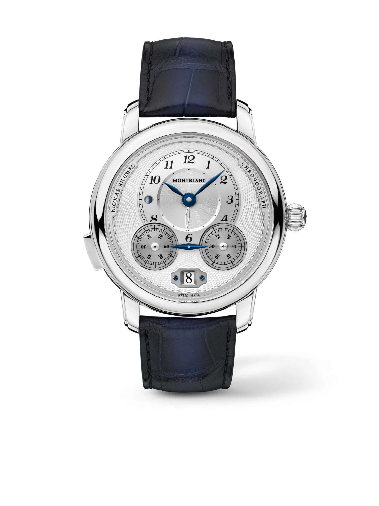 A timepiece with a great history: The Montblanc Star Legacy Chronograph Ref. 118537 is named after Nicolas Rieussec, who in 1821 developed the first chronograph to write in ink on a dial. The 44.8 x 15.02 millimeter stainless steel watch is powered by Montblanc’s Monopusher automatic chronograph movement with superior column wheel mechanism and a power reserve of 72 hours. Two domed titanium rotating discs on the guilloché dial serve as 60-second and 30-minute counters. The time display including a second time zone, which is indicated by a skeletonized hand, deviates upwards.