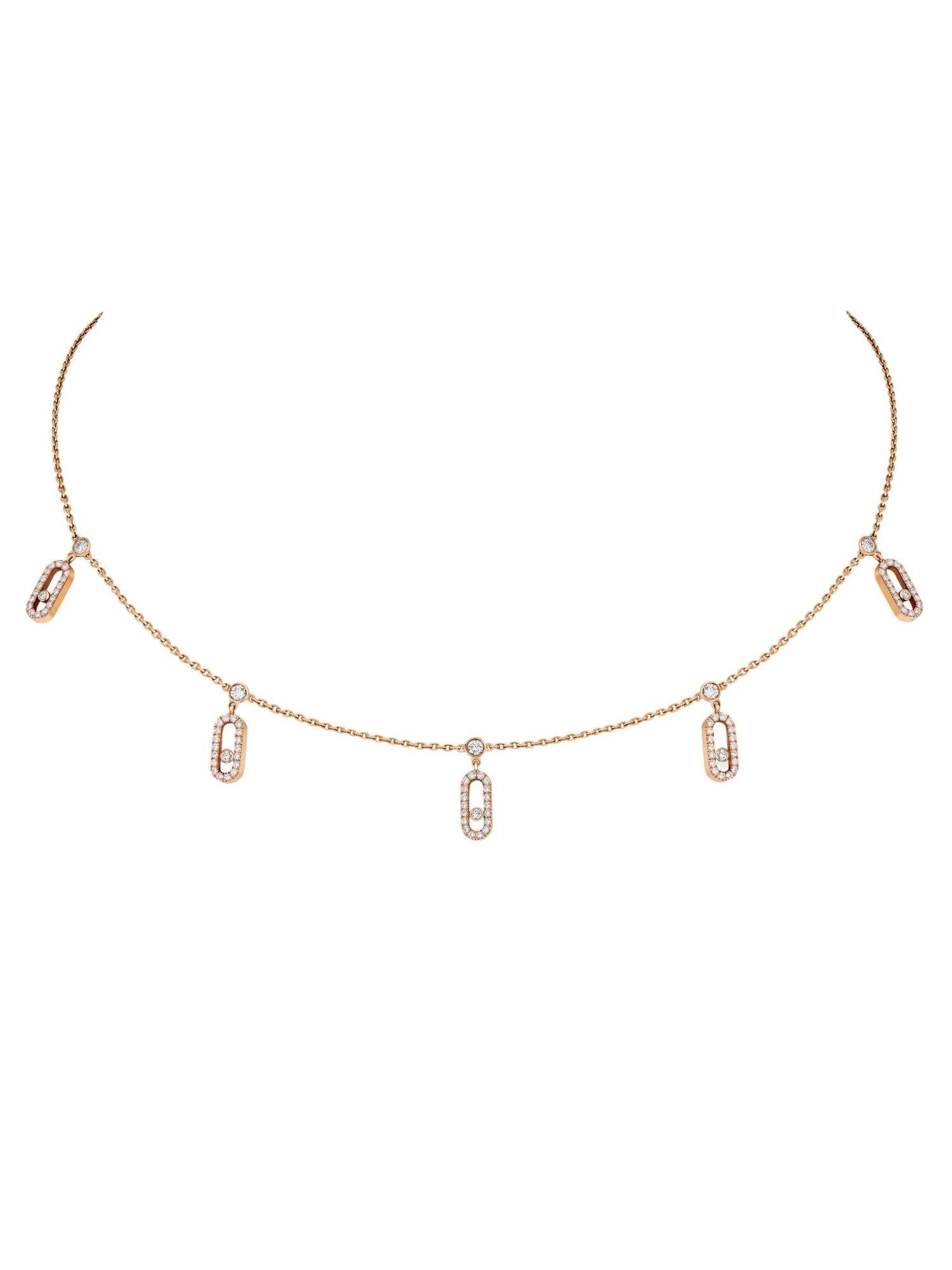 A successful reinterpretation of Messika’s legendary jewelry collection that enchants with its delicacy and a luxurious touch. The fine Move Uno necklace in warmly shimmering 18k rose gold is an elegant eye-catcher featuring five of the collection’s signature Move cages. Each diamond-set cage provides a spectacular stage for a single, freely moving diamond. The pendants are complemented by five additional diamonds that serve as connecting elements to the chain. Shortening eyelets allow the sparkling creation to be worn close to the neck as a trendy choker or as a boho-style necklace.
