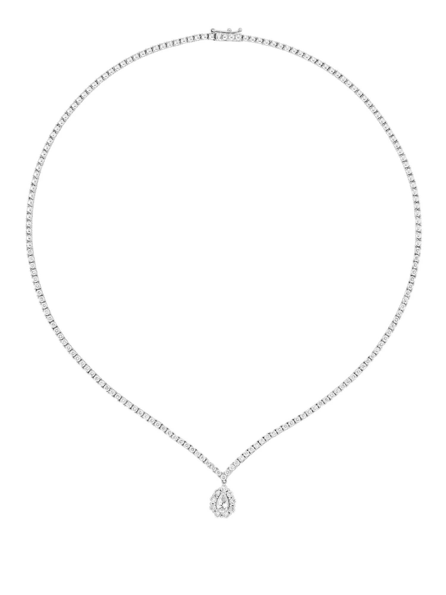 The Opulence by Wempe Statements necklace is pure understatement. A sparkling pear-shaped diamond of 0.50 ct is beautifully encircled by other brilliant-cut diamonds. The delicately crafted eye-catcher is held by a flowing Rivière diamond necklace set with 98 brilliant-cut diamonds totaling 3.08 ct. An elegant and sparkling creation that will give every evening dress the perfect finishing touch.