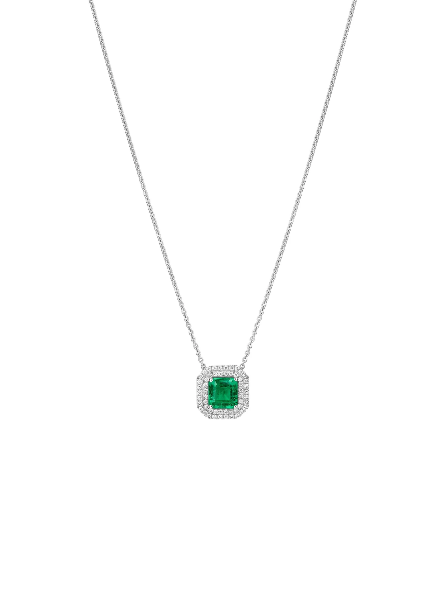 The Opulence by Wempe Statements necklace is the epitome of timeless elegance. Set in 18k white gold and graphically encircled by 54 brilliant-cut diamonds with a total carat of 0.49 carat shines a deep-green emerald of 2.55 ct. The classic emerald-cut and the fabulous inclusions in the gemstone, also described lovingly by connoisseurs as the “jardin”, literally make this jewelry piece an evergreen that will outlast trends and moods.