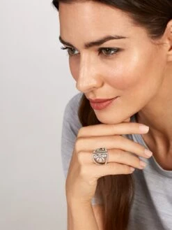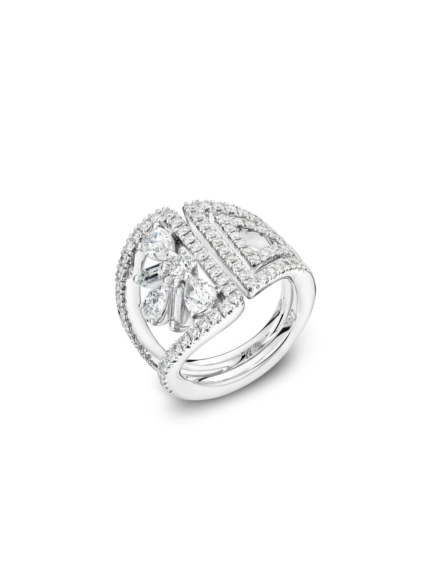 With this diamond ring in 18k white gold the word opulence takes on a totally different meaning. The Opulence by Wempe Statements ring is set with 78 brilliant-cut diamonds that create the stage for the intimated floral leaf formed by three pear-cut diamonds and two baguette-cut diamonds. For sophisticated blossoms that never wilt and designed for a grand occasion.