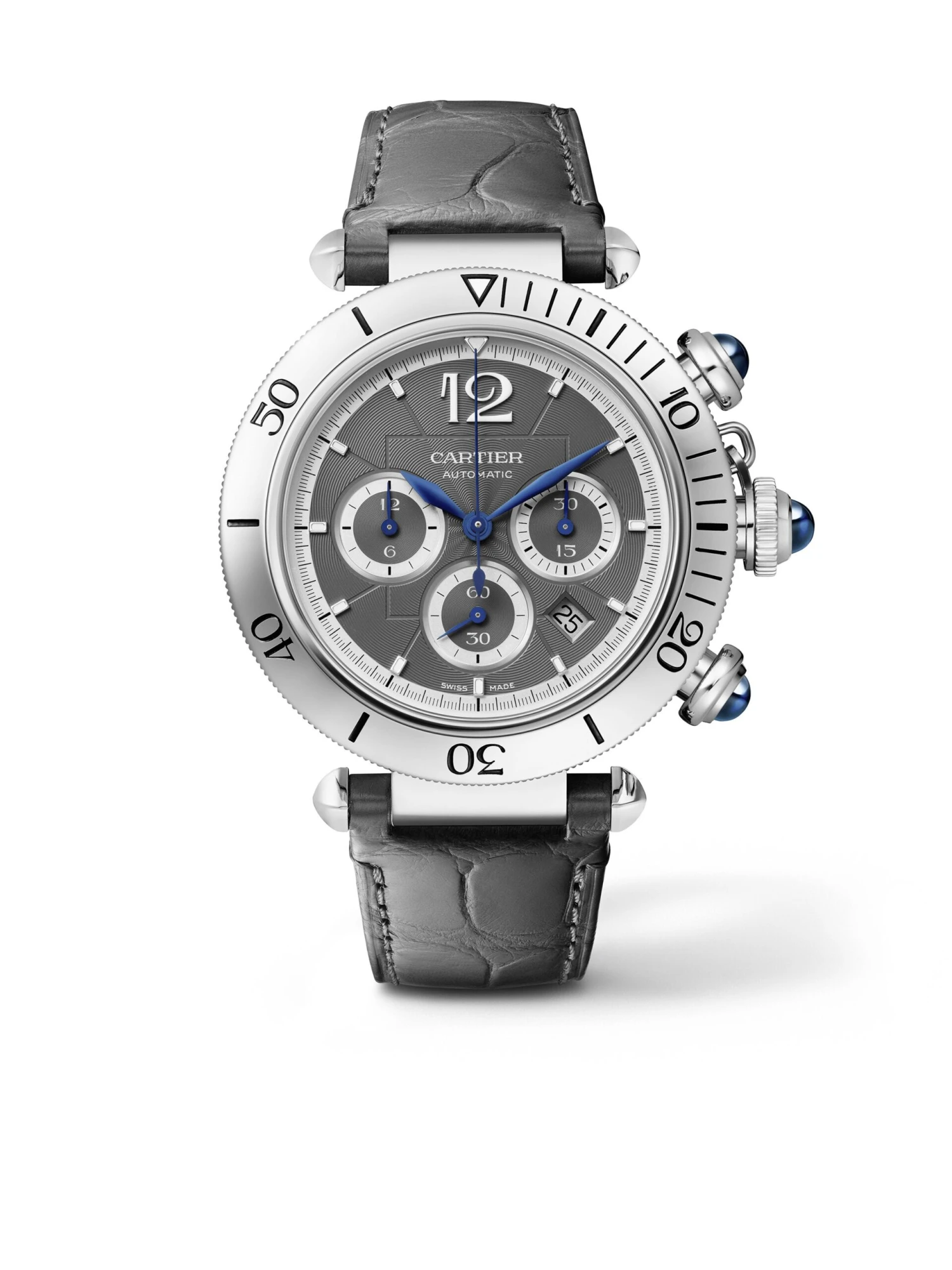 Pasha de Cartier watch, 41 mm, chronograph mechanical movement with automatic winding, caliber 1904-CH MC. Steel case, fluted crown protector, crown and push-pieces set with synthetic spinels, anthracite flinqué dial, blued-steel diamond-shaped hands, steel strap with “SmartLink” adjustment system, second strap in dark gray alligator leather, interchangeable steel deployant buckle. Both are fitted with the “QuickSwitch” interchangeability system. Case diameter: 41 mm, thickness: 11.97 mm. Water-resistant up to 10 bar (approx. 100 meters/330 feet).