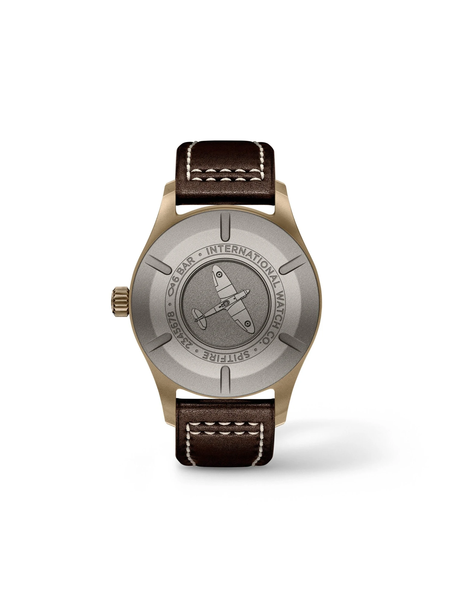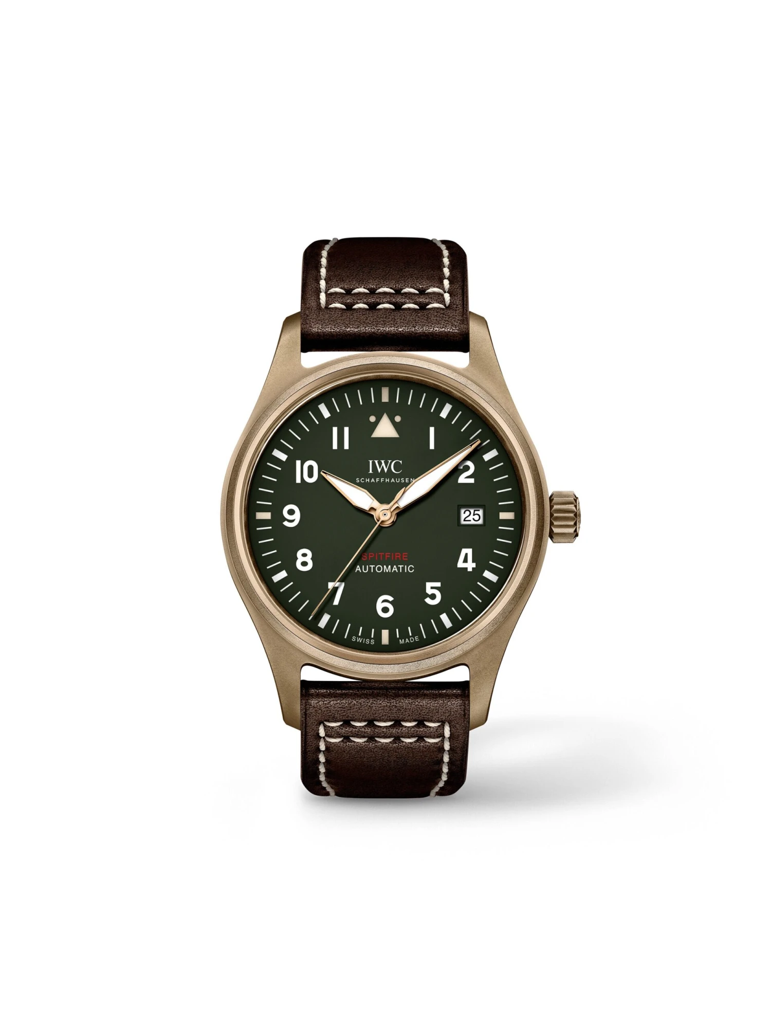 The puristic instrument design of the Pilot’s Watch Automatic Spitfire dates back to the Mark 11 navigation watch, which was produced in Schaffhausen for the British Royal Air Force from 1948. The new IWC manufacture caliber 32110 is used for the first time in this functional timepiece, which measures a moderate 39 mm in line with the original. The robust self-winding movement has a bidirectional jack winding mechanism that generates a power reserve of 72 hours. An inner cage made of soft iron in a bronze case effectively protects the movement from magnetic fields. The green dial and brown calf strap are also eye-catchers of this unique pilot watch.