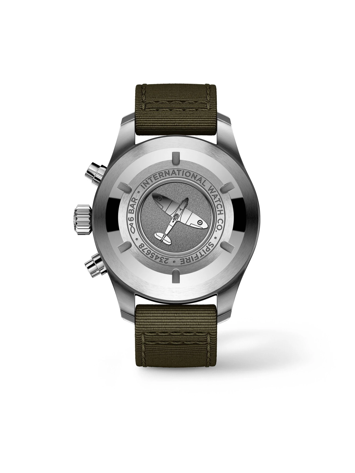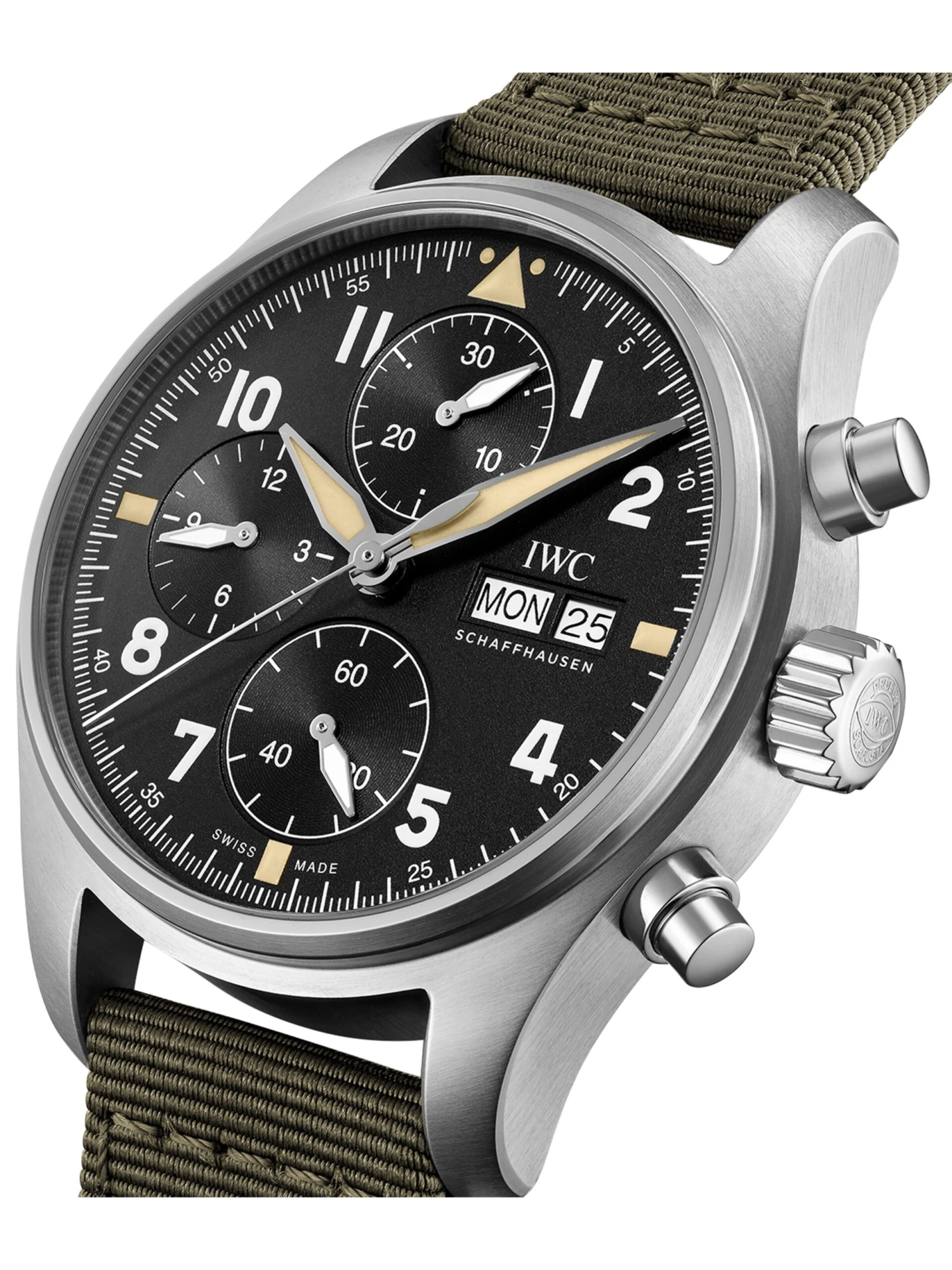 For the first time ever, IWC is presenting an aviation chronograph with a movement from the 69000 caliber family and in a reduced case diameter of 41.0 mm. The automatic manufacture caliber 69380 is a robust chronograph movement in classic column-wheel design with a bidirectional click-winding mechanism. It displays the stopped hours and minutes on two subsidiary dials at 9 and 12 o’clock on the black noctilucent dial. In the stainless steel case, an inner cage made of soft iron effectively protects the movement from magnetic fields. The Pilot’s Watch Chronograph Spitfire Ref. IW387901 features a green textile strap inspired by the original Spitfire.