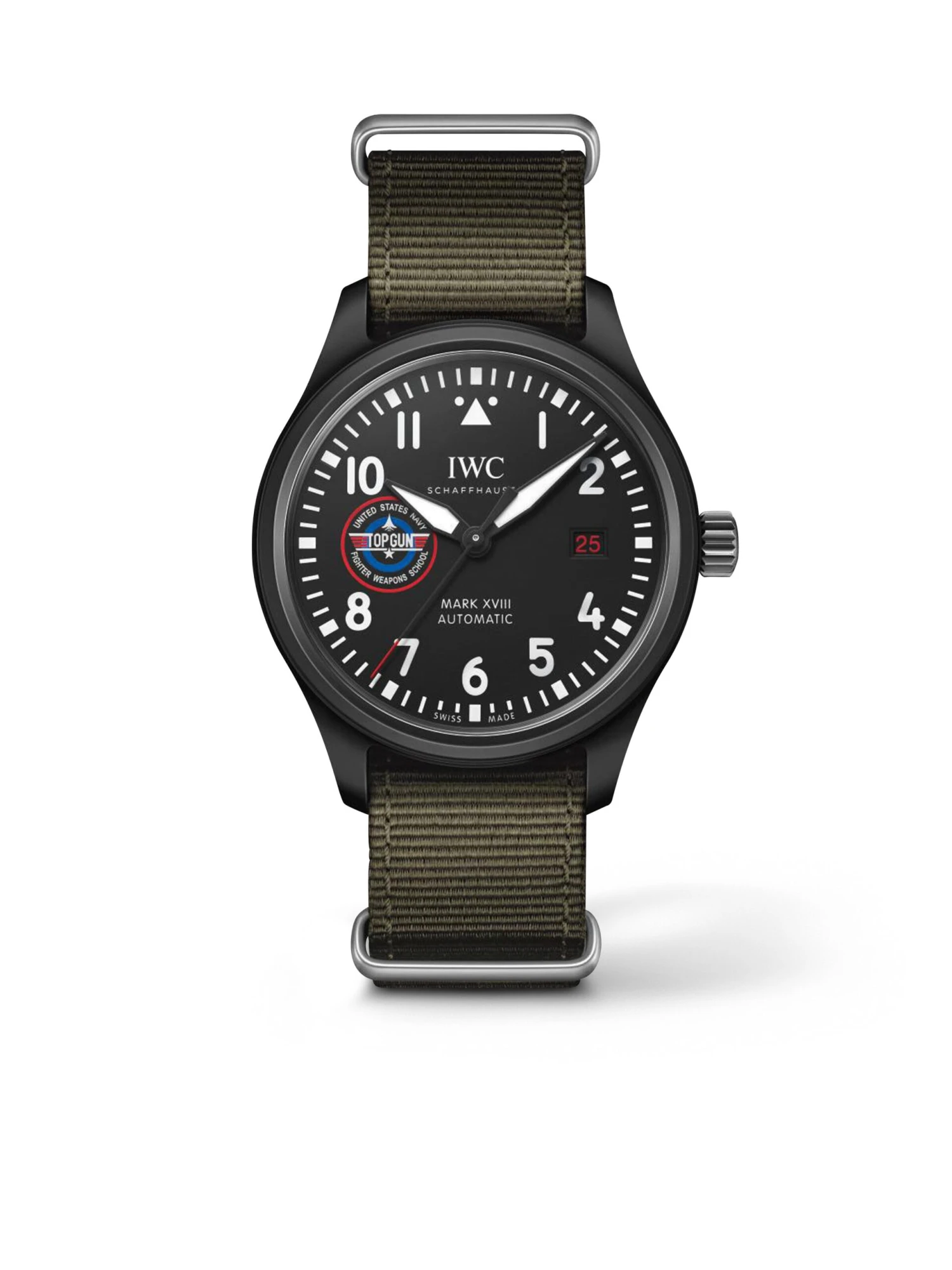 Pilot’s watch legends such as the Mark 11 from 1948 are not only milestones in the company’s history, but have had a lasting influence on the appearance of classic pilot’s watches. With the Pilot’s Watch Mark XVIII Ref. IW324712, IWC offers now an attractive entry-level model in the popular TOP GUN Edition. Everything has also been designed here for clarity and ease of use. The Arabic numerals are large and round in their place with two exceptions: The typical pilot’s triangle with lateral dots for orientation is positioned on the number twelve, and the date appears at three o’clock. The TOP GUN logo appears on the dial at nine o’clock and is engraved on the stainless-steel caseback of the 41 millimeter large case.
