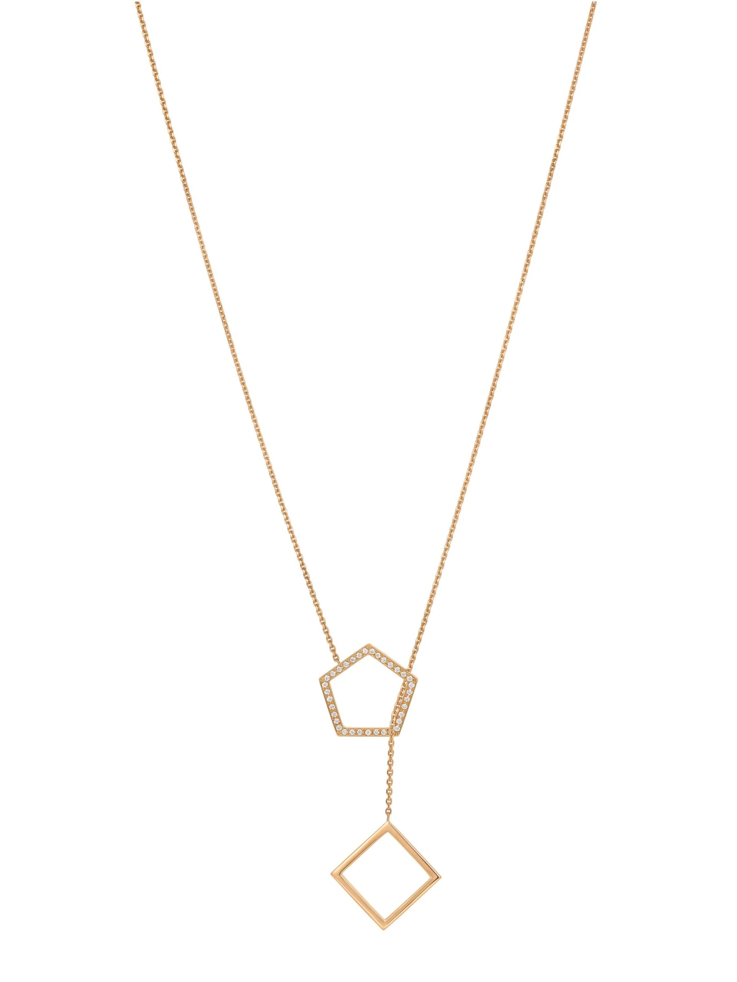 The Playlist BY KIM pendant boasts two striking elements. A cable chain connects a simple square to the diamond-studded pentagon in a refined manner, creating a necklace in the popular “Y” style. Alongside the warm and radiant 18k rose gold, there are 35 brilliant-cut diamonds weighing 0.17 ct to add a touch of luxury to the dynamic creation. Ensure variety in your jewelry styling with Playlist BY KIM, totally to the beat of your own drum.