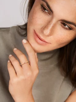 When the string section kicks in and a song turns into a true masterpiece. The Playlist BY KIM rose gold ring may seem simple at first glance, but its unconventional upright ring band will turn your look into a delicate work of art. One jewelry line – an infinite number of combinations. Every woman finds her own style with Playlist BY KIM. Totally to the beat of your own drum.