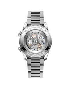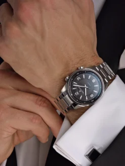 The Polaris Automatic with two crowns is a sporty watch for everyday use. The crown at two o’clock adjusts the inner rotating ring. The second crown at four o’clock is used to set the time. The black dial with its three levels has a very sculpted effect. The partly brushed, partly polished stainless steel case with a diameter of 41 millimeters and a height of 11.2 millimeters houses an automatic manufacture movement.