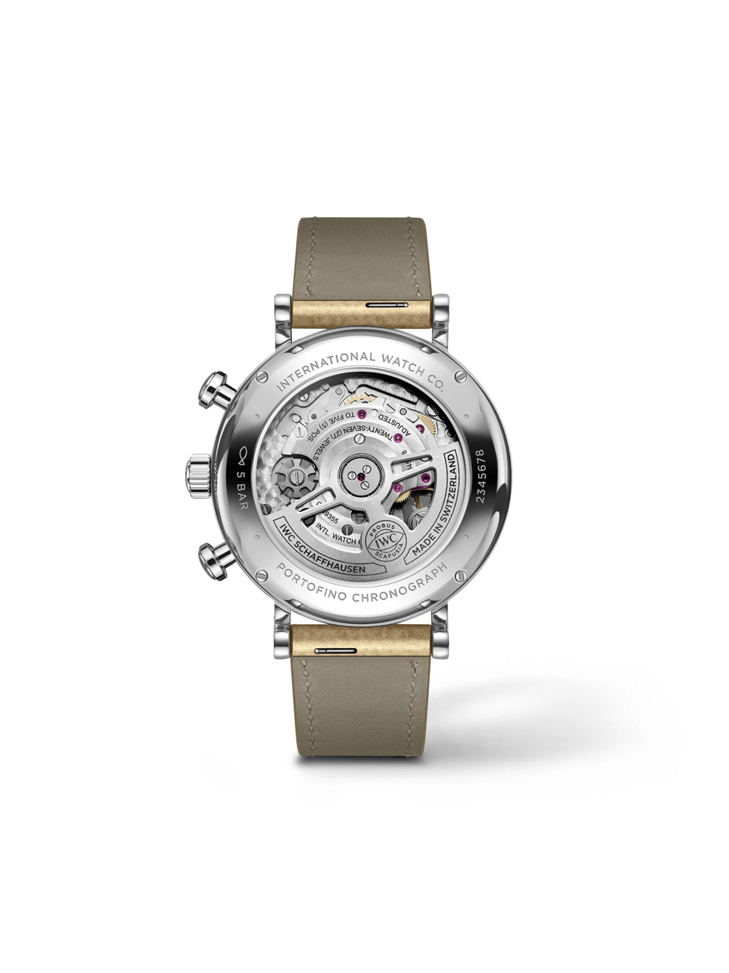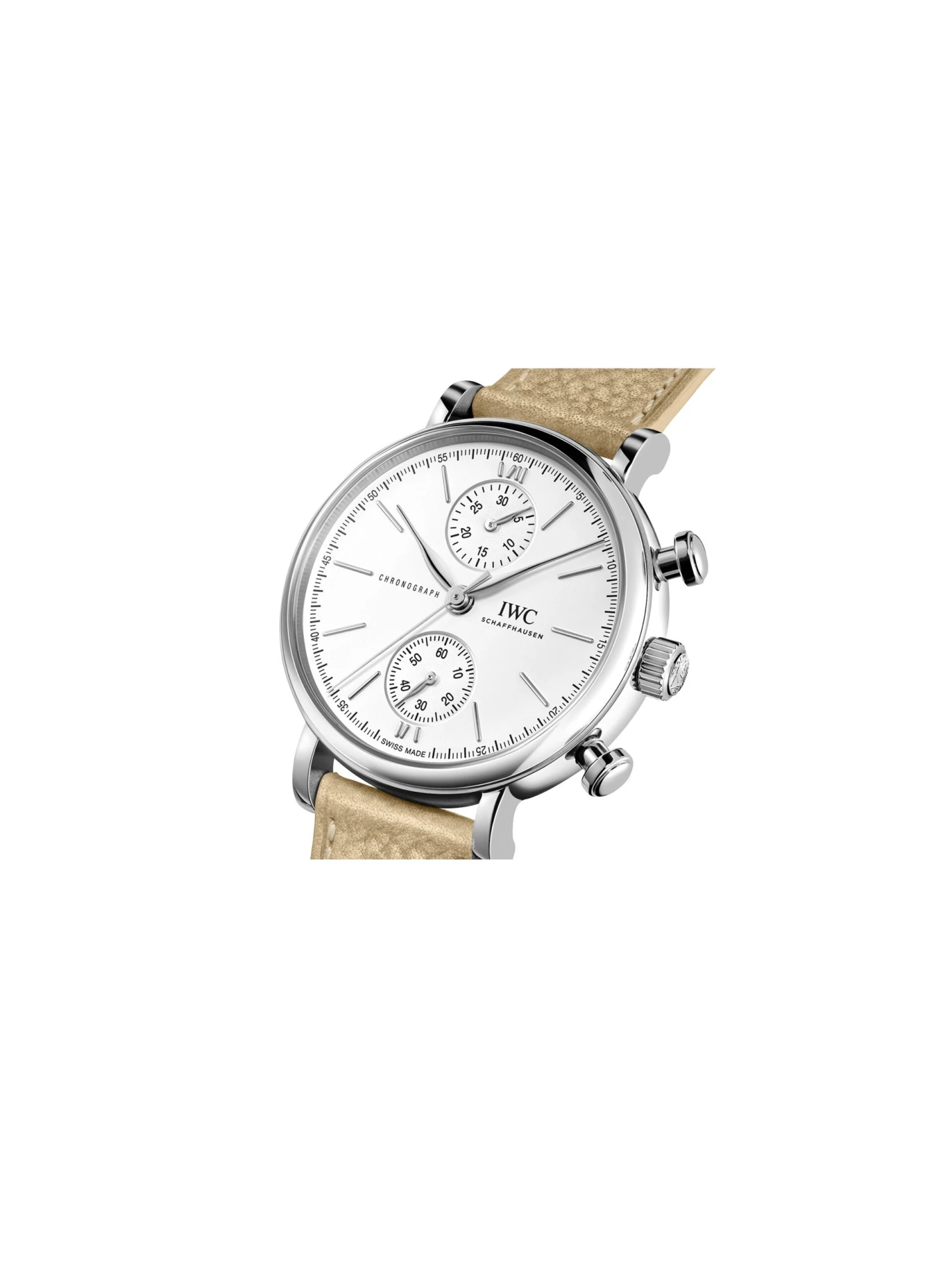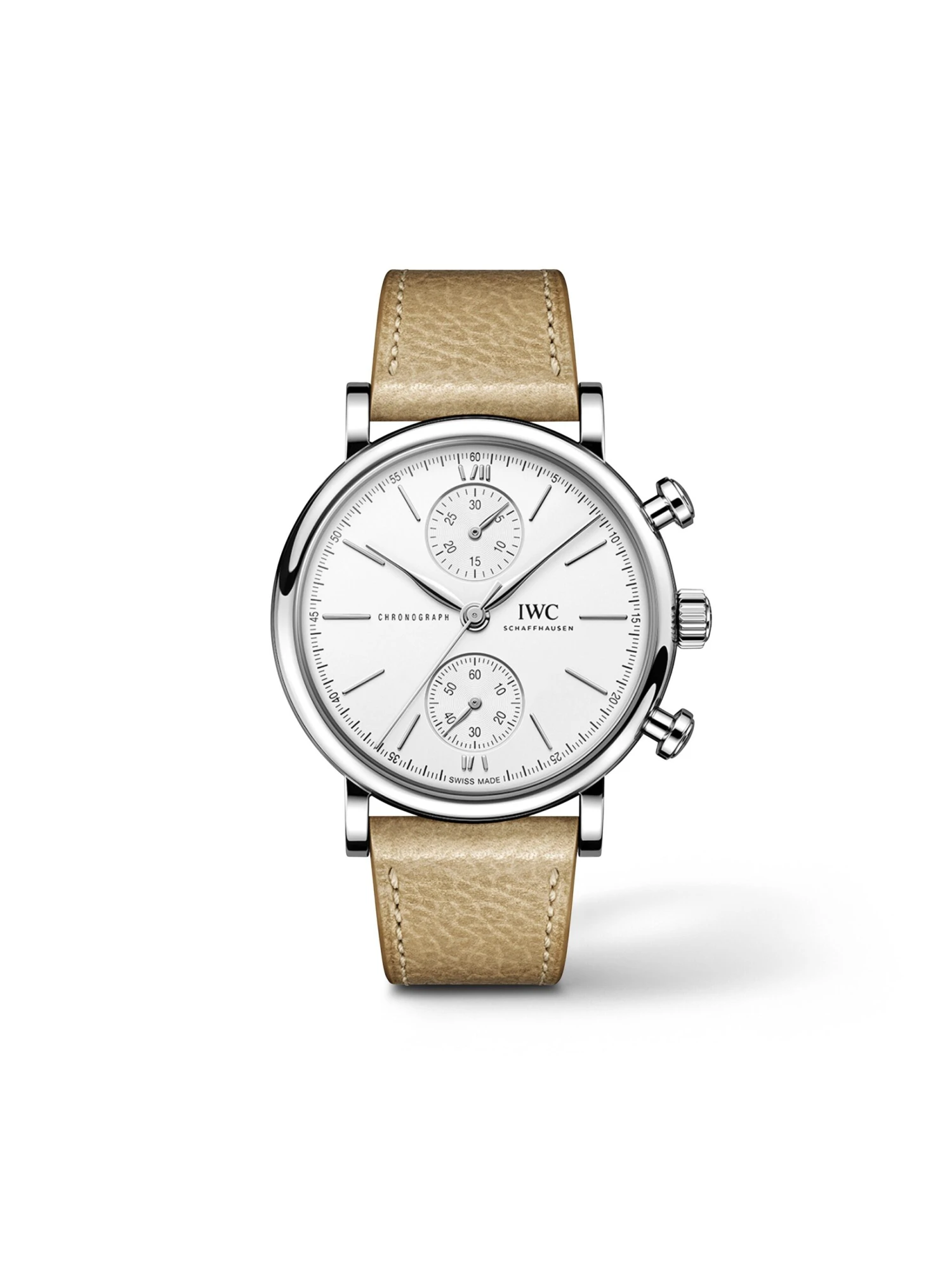 A subtle splash of sportiness combined with the classically elegant design of the original model from 1984. The Portofino Chronograph 39 (Ref. IW391502) from IWC Schaffhausen. presents itself with a compact 39-millimeter stainless-steel case and the characteristic pushpieces. On the argentĂ© dial, the rhodium-plated feuille hands and slim hour markers shine brightly. The minute counter at 12 o’clock and the small seconds subdial at 6 o’clock complete the uncluttered dial design. Inside the case, there is IWC manufacture caliber 69355 with a power reserve of up to 46 hours, displaying its classic column-wheel design through a sapphire crystal caseback. A beige calfskin strap stylishly completes the look of this timepiece, which is water-resistant to 50 meters.