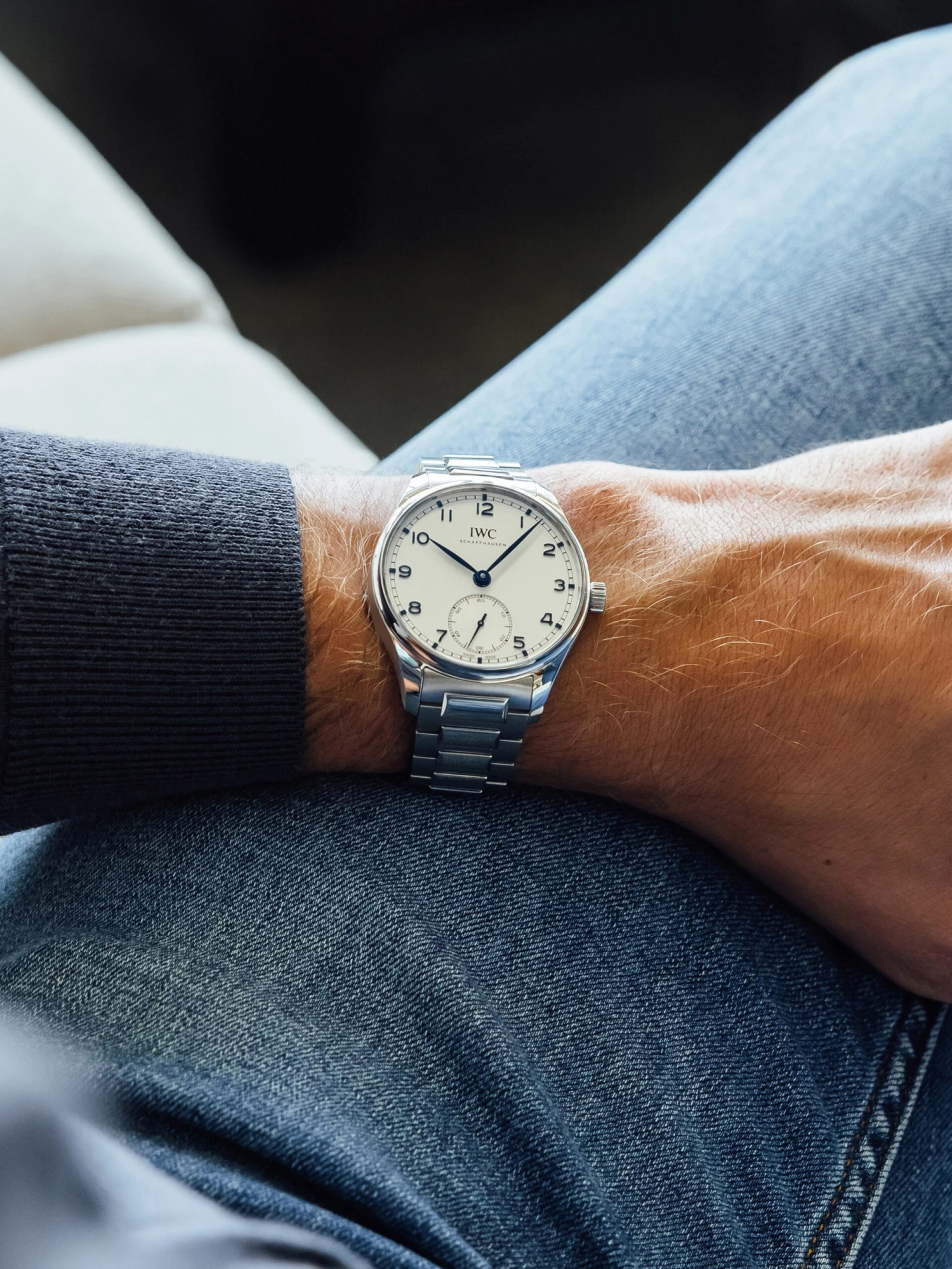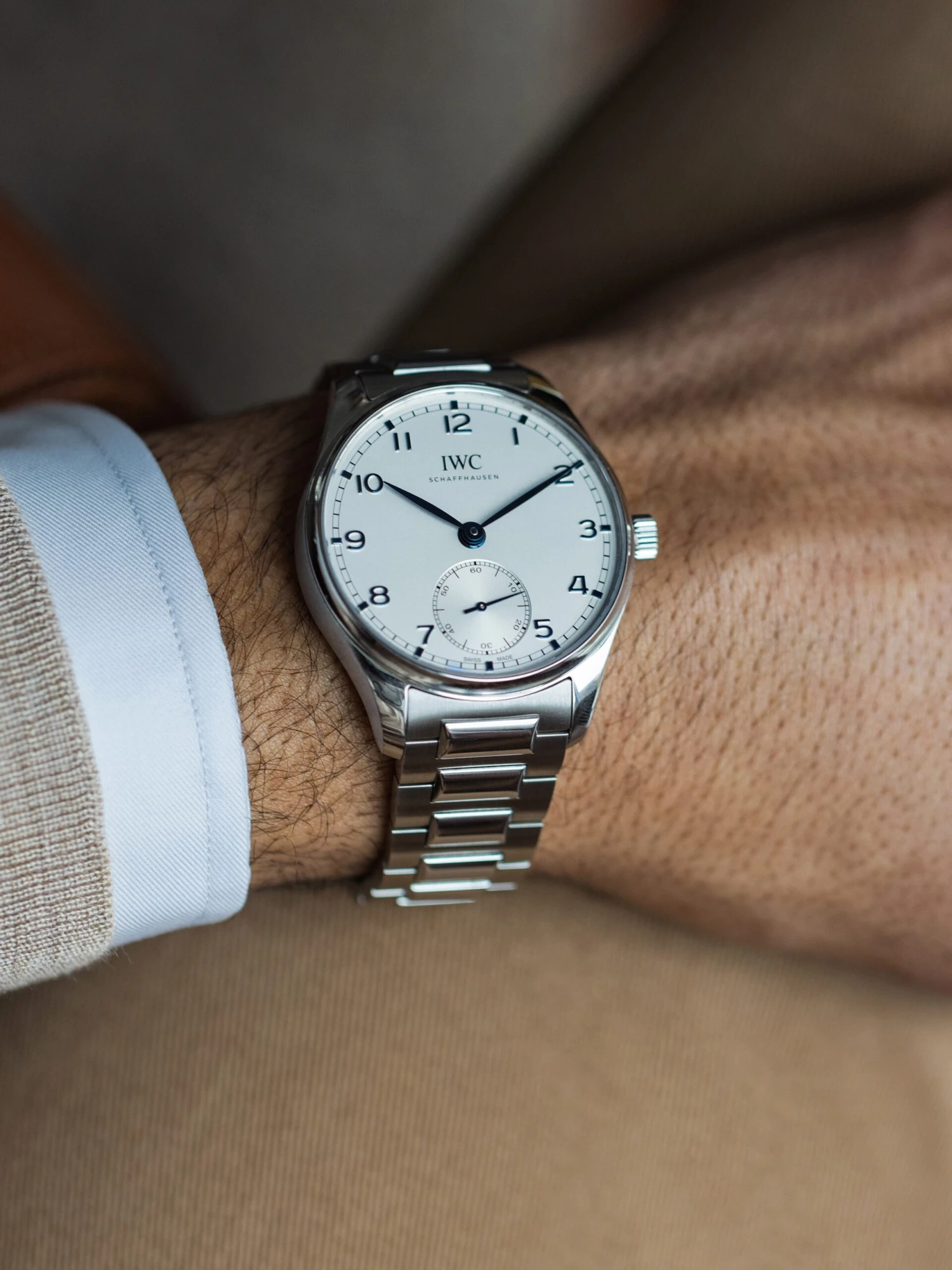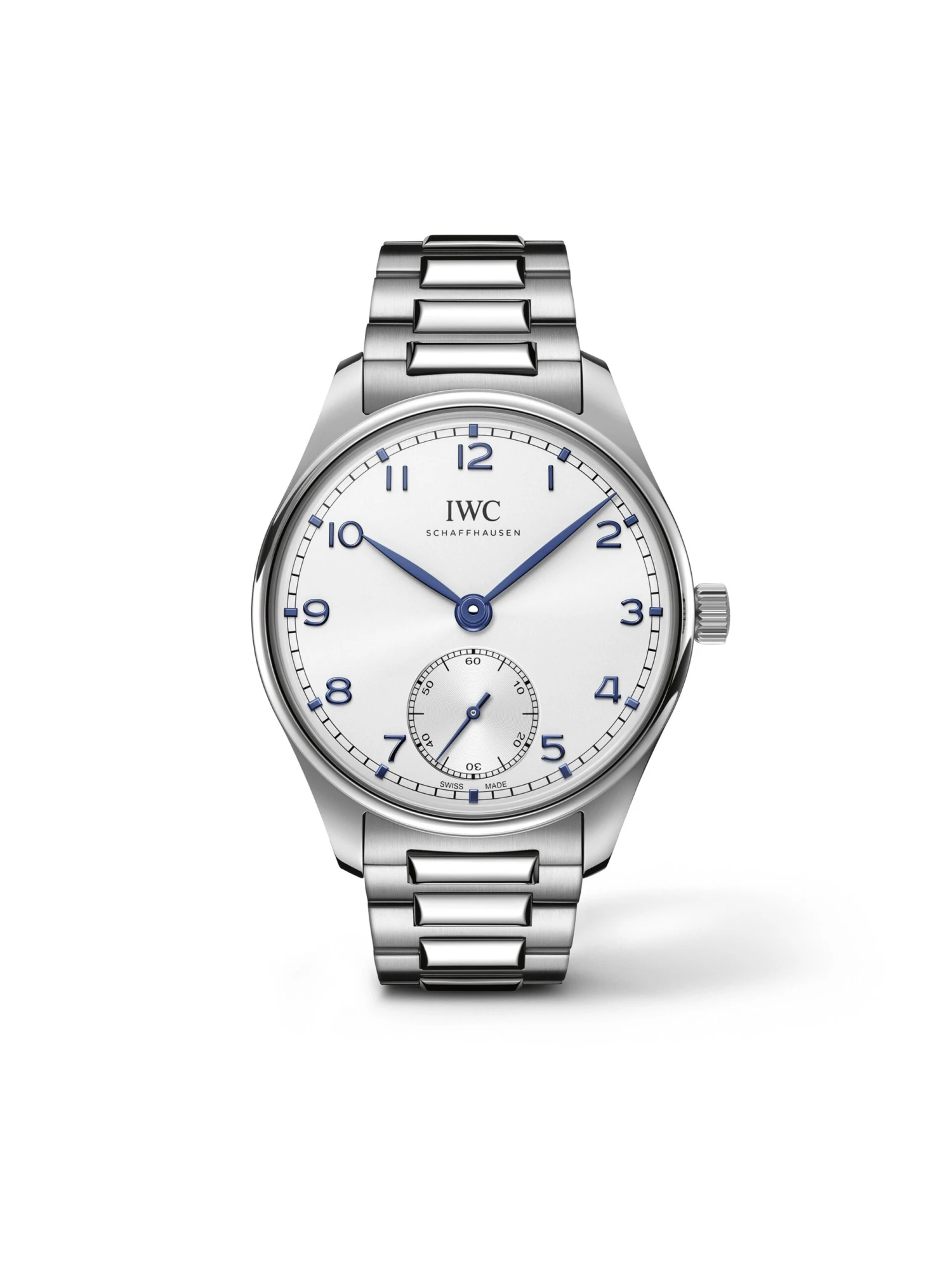 The classic Portugieser Ref. IW358312 from IWC Schaffhausen with a silver-colored dial and blue hands and markers adapts to every wearer and every situation. The seconds are displayed off-center at six o’clock. Inside the 40.4-millimeter stainless-steel case, there is self-winding manufacture caliber 82200 with a power reserve of 60 hours. Fitted on a stainless-steel bracelet, this is a dresswatch par excellence.