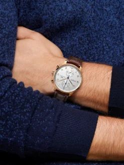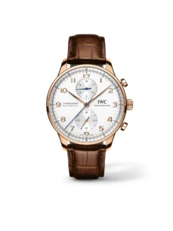 The Portugieser Chronograph Ref. IW371480 has been presenting time measurement in a deeply elegant form since 1998. The 40.9 millimeter and 12.6 millimeter high chronograph in 18k rose gold incorporates all the characteristics of the legendary line, from the razor-sharp clear railroad minute markers to the striking Arabic numerals and the classic feuille hands. On top of this are the recessed totalizers and the circumferential precision scale. But the watch is not only convincing in terms of its design: With the automatic caliber 79350, it has one of the best chronograph movements the brand has to offer.