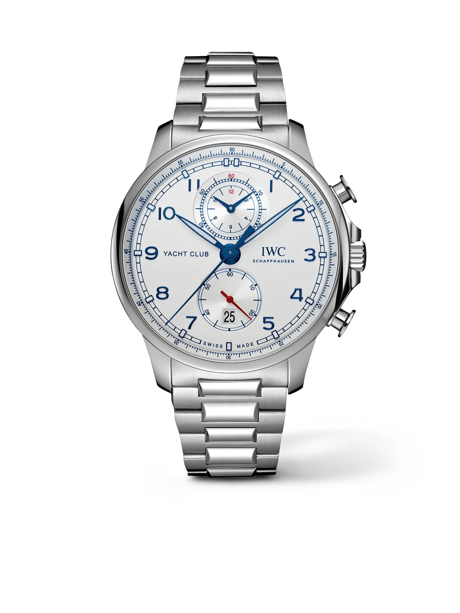 The Portugieser Yacht Club Chronograph Ref. IW390702 is considered to be the most sporty watch within the Portugieser collection. Equipped with the specially developed automatic manufacture caliber 89361, this chronograph impresses in every respect. The stainless steel strap and the flyback function of the chronograph offer additional sporty features. The case, measuring 44.6 millimeters in diameter, accentuates the sporty and masculine character of this timepiece.