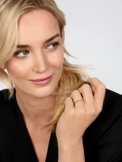 Let your heart speak. The ring Promise Amphora BY KIM firmly nestles the 0.40 ct diamond in the popular cushion cut. Held securely in a bezel setting and visually enlarged, the sparkling solitaire is enthroned above the 18k white gold ring band set with 20 brilliant-cut diamonds, which is modelled on the shape of a Greek amphora. A ring made to ask the question of all questions.