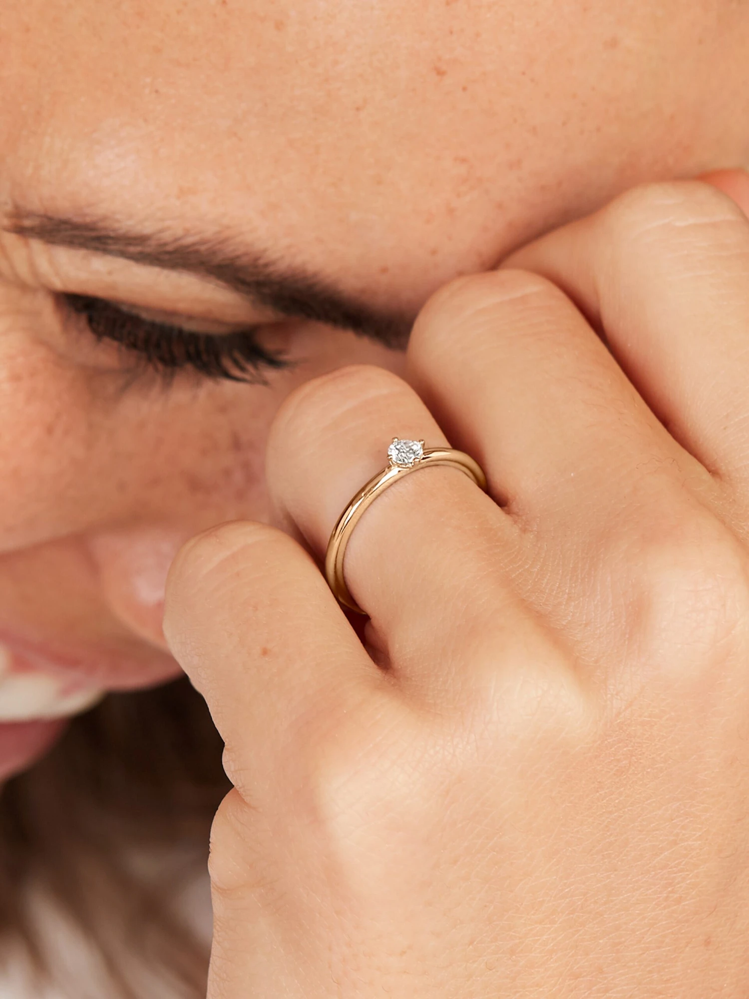 A dream promise: The Promise BY KIM ring allows nothing to distract from the pure beauty of its form. A 0.17 ct brilliant-cut diamond forms the discreet but lustrous focal point on the delicate 18k rose gold band. The dainty solitaire in a prong setting and puristic design highlight the sophistication of this jewel. A ring of timeless elegance that you will want to wear every day.
