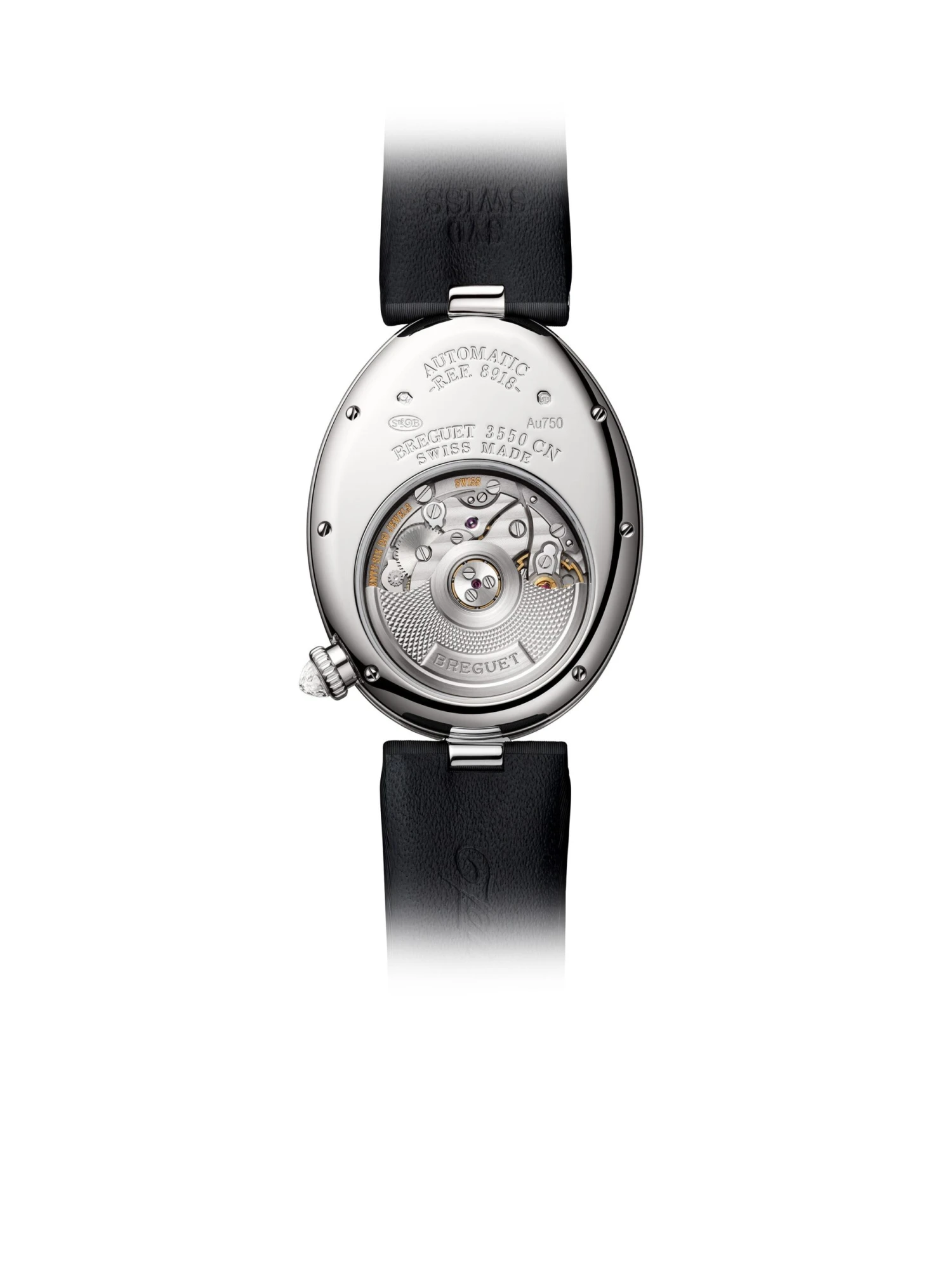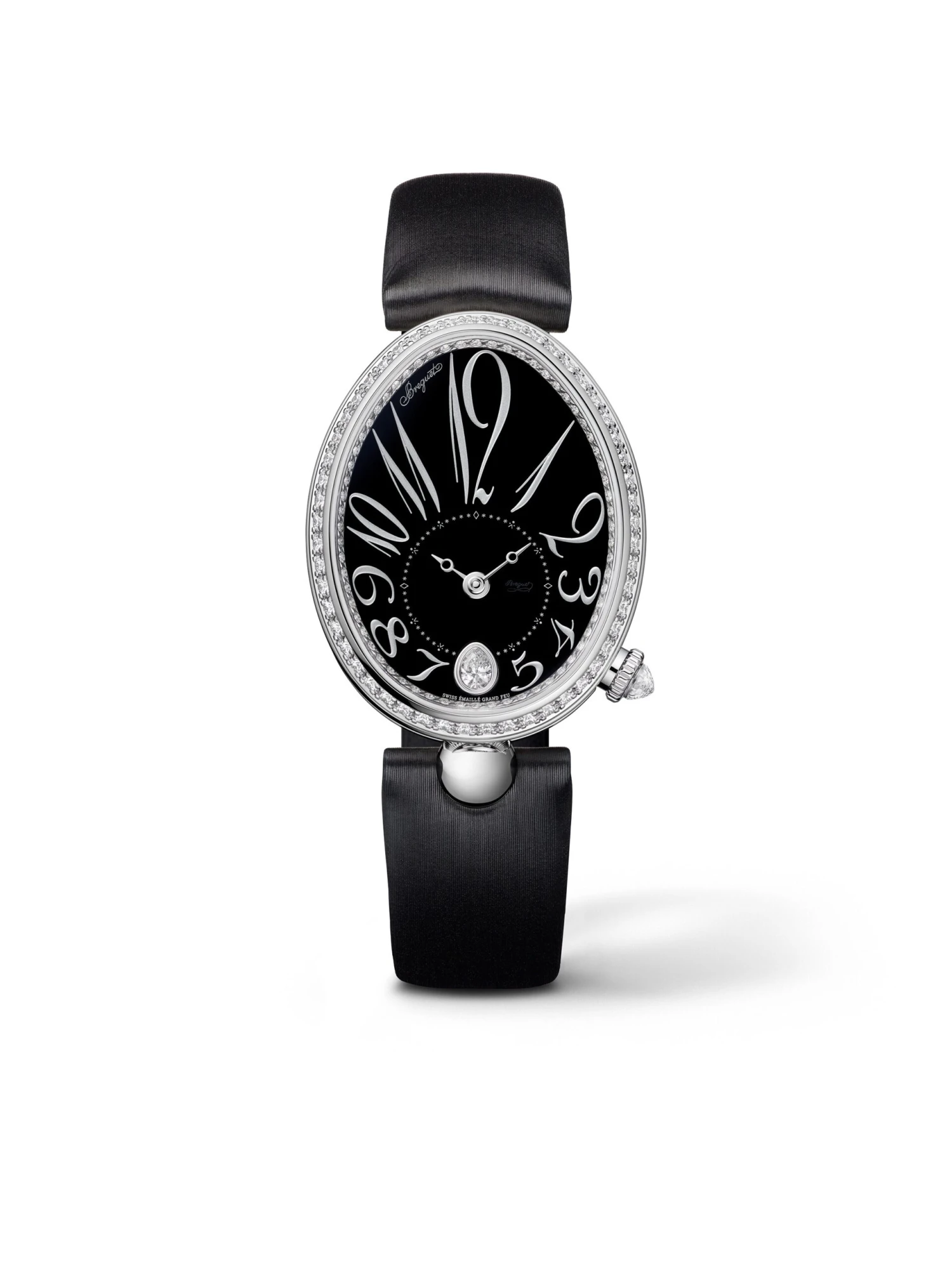 With its combination of first-class mechanics and sophisticated jewelry, Breguet’s Reine de Naples line has been captivating its beholders since its debut in 2002. The finest example is the Reine de Naples 8918 (Ref. 8918BB/2N/764/D00D) with a black “Grand Feu” enamel dial. The hour, minute and small seconds subdial are surrounded by 117 brilliant-cut diamonds on a design that is shifted to six o’clock. The 36.5 x 28.45 x 10.05 millimeter 18k white gold case houses self-winding manufacture caliber 537/3 with a power reserve of 45 hours. A black alligator-skin strap completes the luxurious appearance of this regal ladies’ watch.