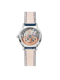 The stainless steel case of the Rendez-Vous Moon measures 34 millimeters in diameter and 9.56 millimeters in height and houses an automatic manufacture caliber. The silver-colored dial with blue Arabic numerals in floral style and moon-phase display above six o’clock, together with the diamond-studded bezel, is a true sensation.