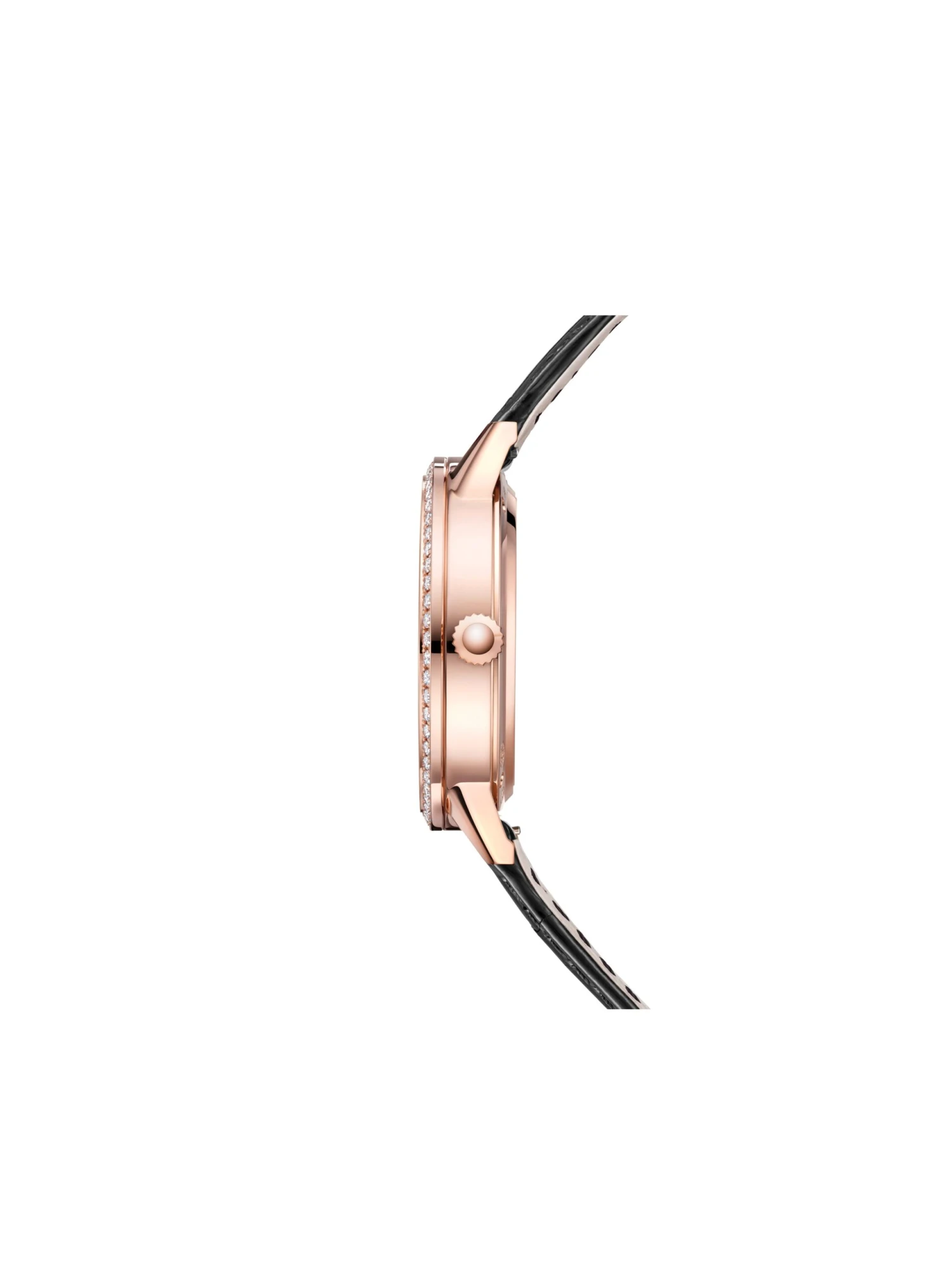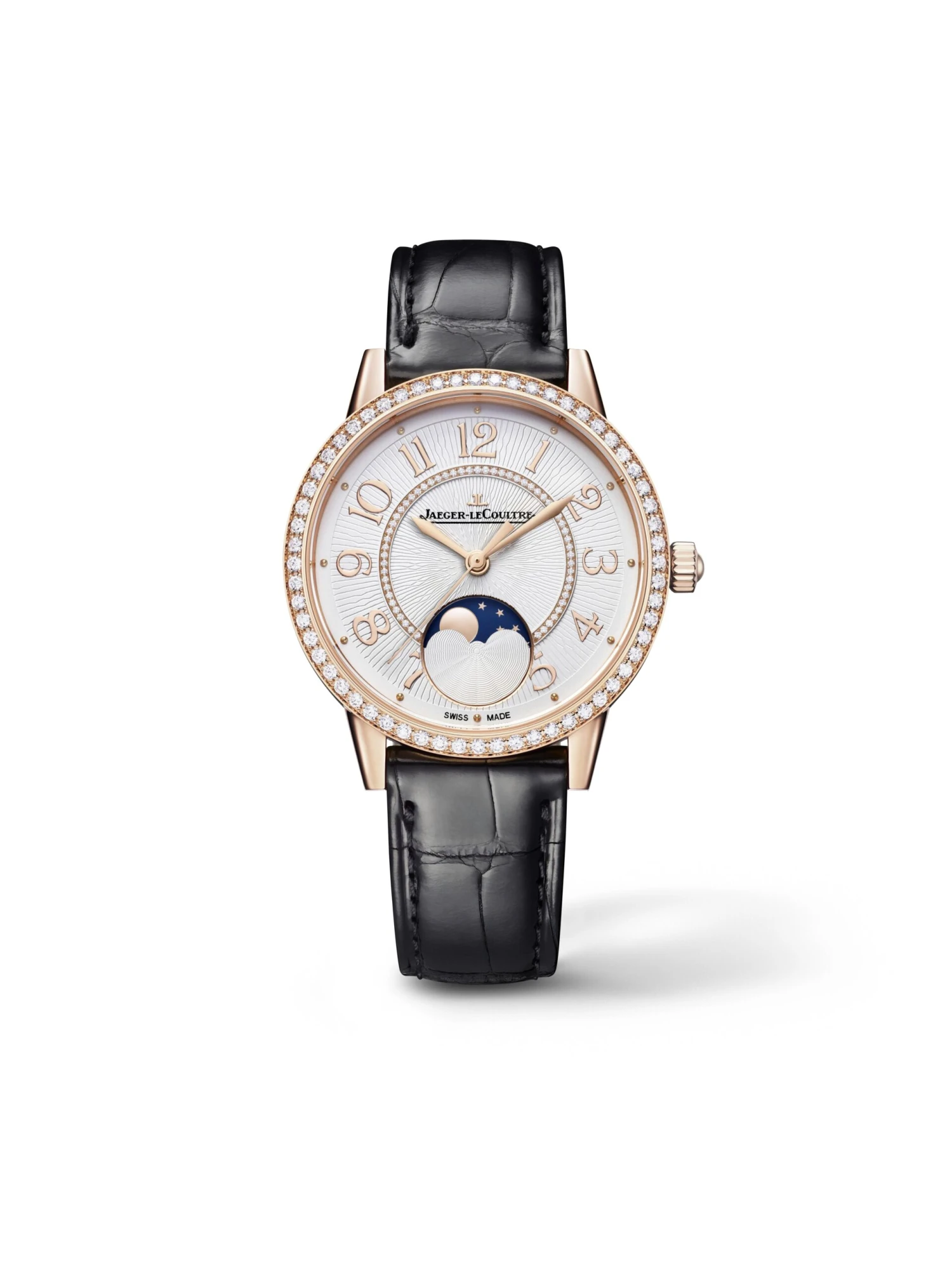The Rendez-Vouz Moon 18k rose gold case measures 34 millimeters in diameter and 9.56 millimeters in height and houses an automatic manufacture caliber. The cream-colored dial with golden Arabic numerals in floral style and moon-phase display above six o’clock, together with the diamond-studded bezel, is a true sensation.