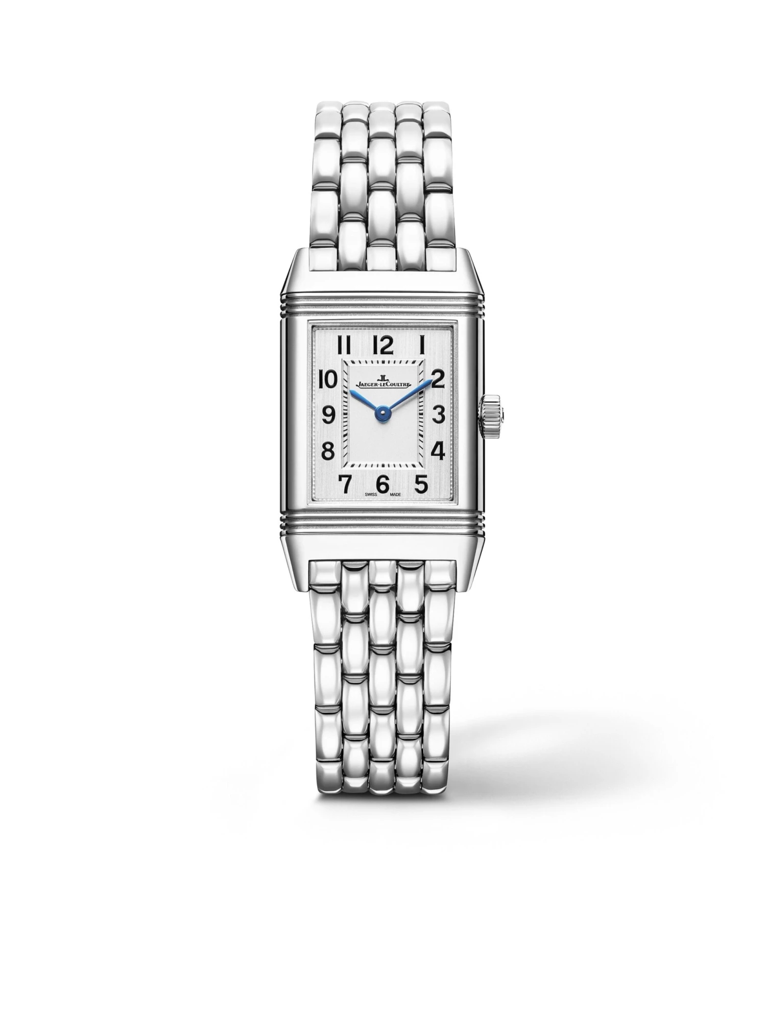 The Jaeger-LeCoultre’s Reverso Classic Monoface (Ref. 2618140) brings to the fore the special appeal of the Reverso collection and is powered by an in-house quartz movement. The dial is silver-colored with black Arabic numerals and classic blue hands. The polished surface of the back protects the watch and provides space for your own personal engraving. The stainless steel case measures 35.8 by 21 by 7.4 millimeters.