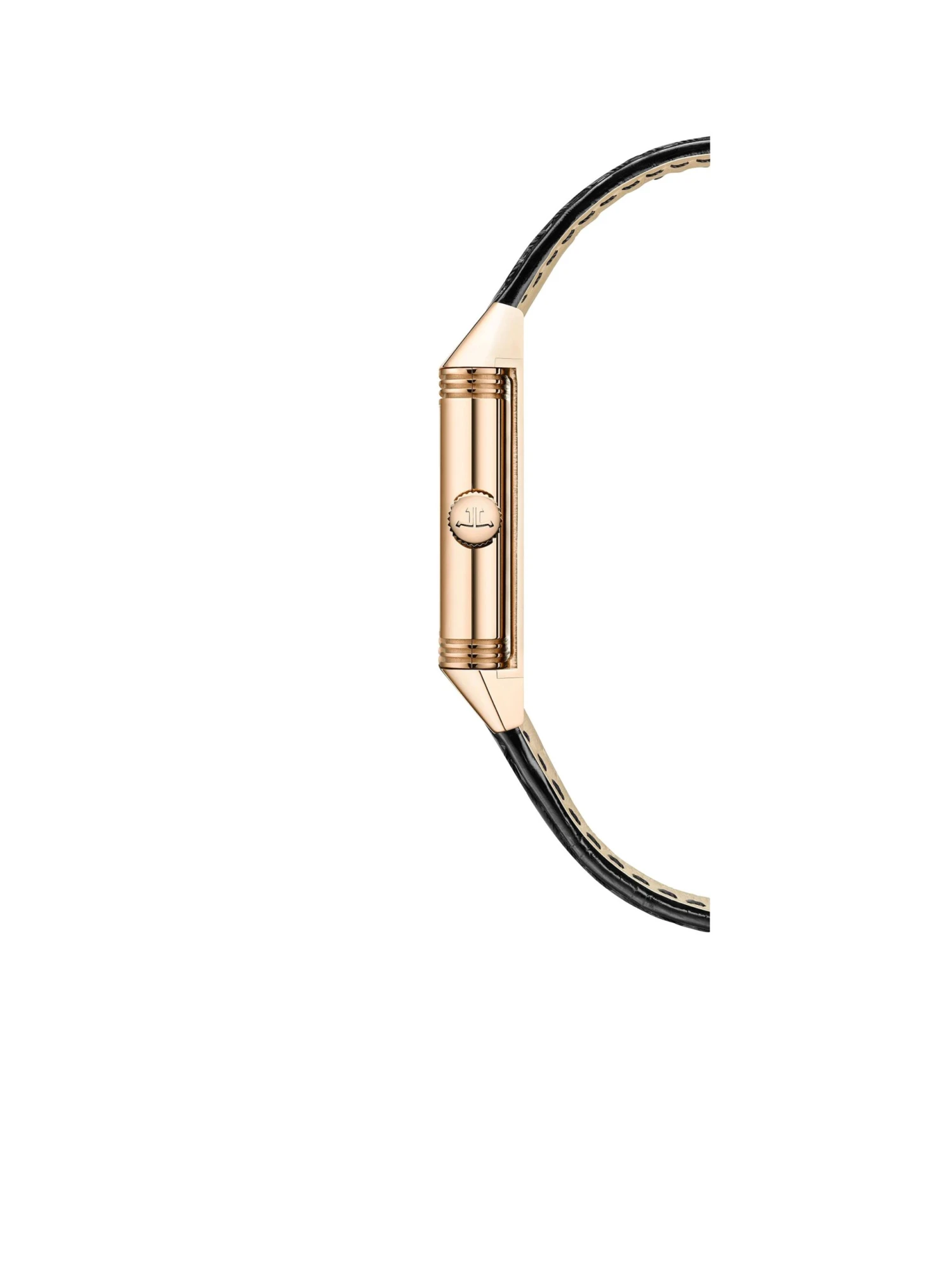 Timeless elegance combined with legendary Art Deco elements – featuring a silver-gray dial with guilloché and vertical satin finish and gold baton hands, the Reverso Classic Small Monoface in rose gold dominates the angular watch segment. The classic case with characteristic Godrons is water-resistant to 3 bar and houses hand-wound manufacture caliber 846/1. Measuring 35.78 x 21 millimeters, the watch fits snugly around slimmer female wrists and convinces even sophisticated enthusiasts of vintage treasures.