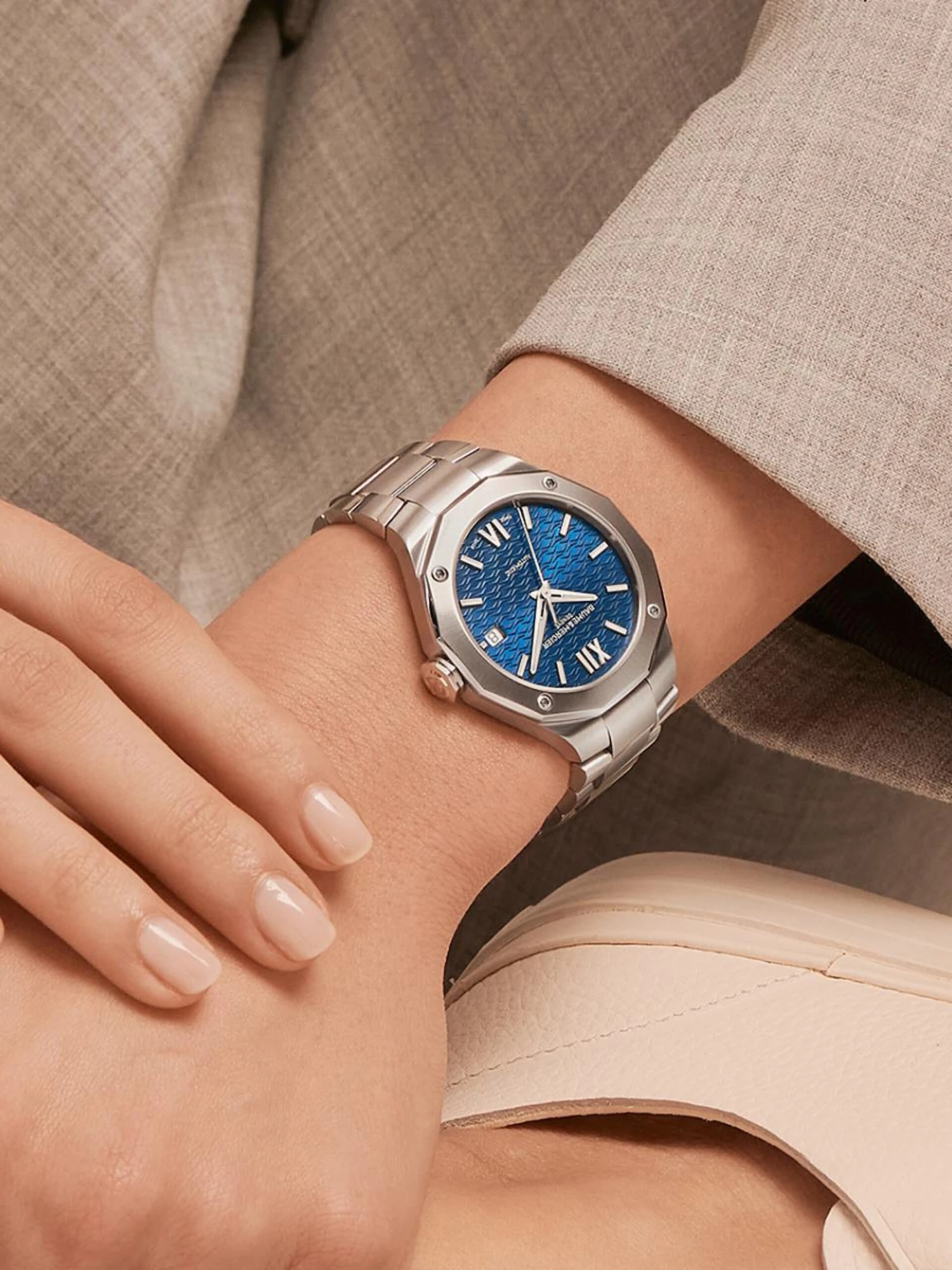 Baume et Mercier launches the sixth generation of the Riviera, which has been one of the Maison’s icons since 1973. The sporty Riviera Automatic 36 mm Ref. M0A10679 with a stainless-steel bracelet and a 36-millimeter stainless-steel case features the distinctive twelve-sided titanium bezel with its four characteristic screws. Faceted hands and Roman numerals set shimmering accents on the blue sunburst dial with the legendary wave pattern. The three-hand watch with date display at three o’clock is water-resistant to approx. 50 meters and powered by Swiss self-winding caliber Sellita SW200.