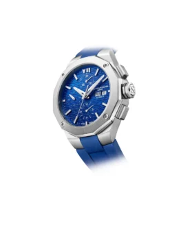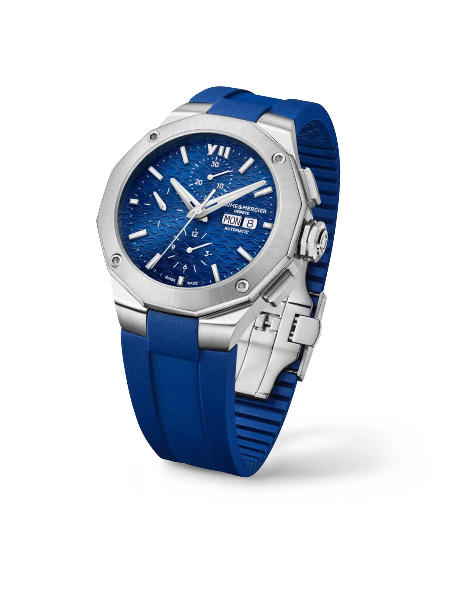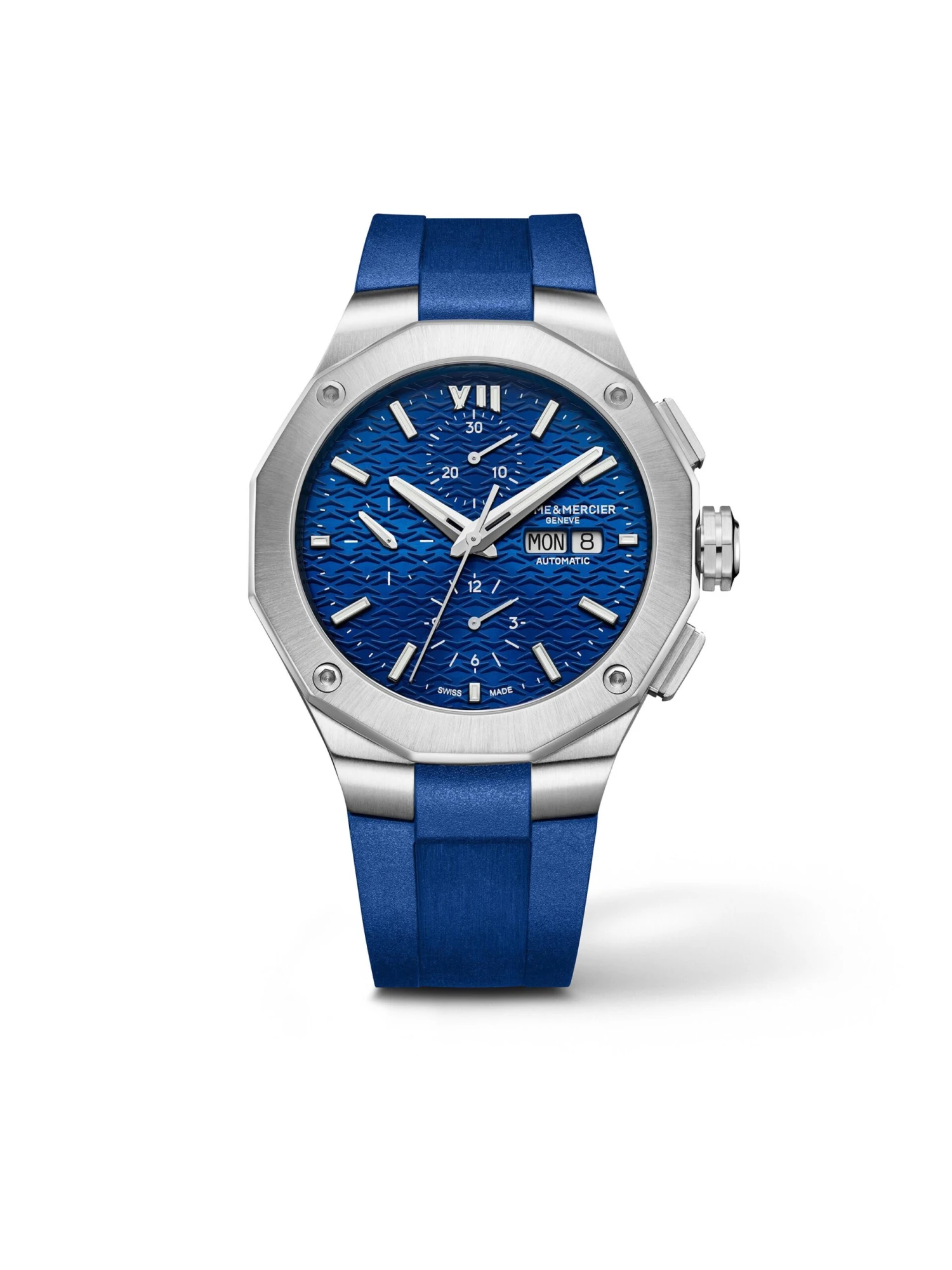 Baume et Mercier launches the fifth generation of the Riviera. The elegant chronograph (Ref. M0A 10623) with a blue rubber strap and a 43-millimeter stainless-steel case features the distinctive twelve-sided bezel with its four characteristic screws. The unique design of the blue dial with white hands and hour markers and a day and date display at three o’clock represents the encounter of the mountains and the ocean. Inside the case, which is water-resistant to 5 bar, there is Swiss-made self-winding movement Valjoux 7750.