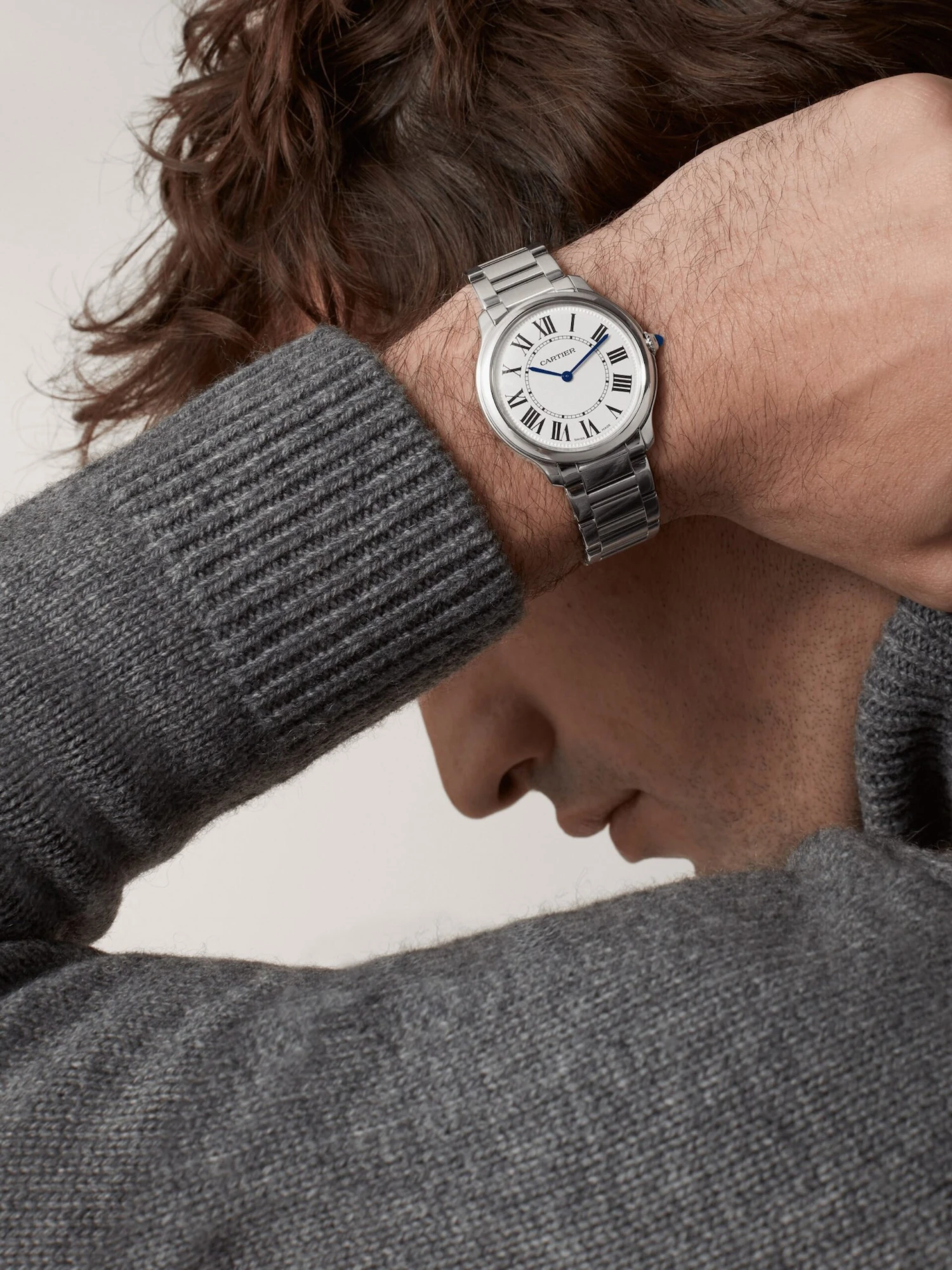 Ronde Must de Cartier watch, 36 mm, high autonomy quartz movement (approx. 8 years). Steel case, beaded crown set with a synthetic cabochon-shaped spinel, sandblasted silver dial, blued-steel sword-shaped hands, sapphire crystal, steel strap fitted with an interchangeability system. Thickness: 7.89 mm. Water-resistant to 3 bar (approx. 30 meters/100 feet).