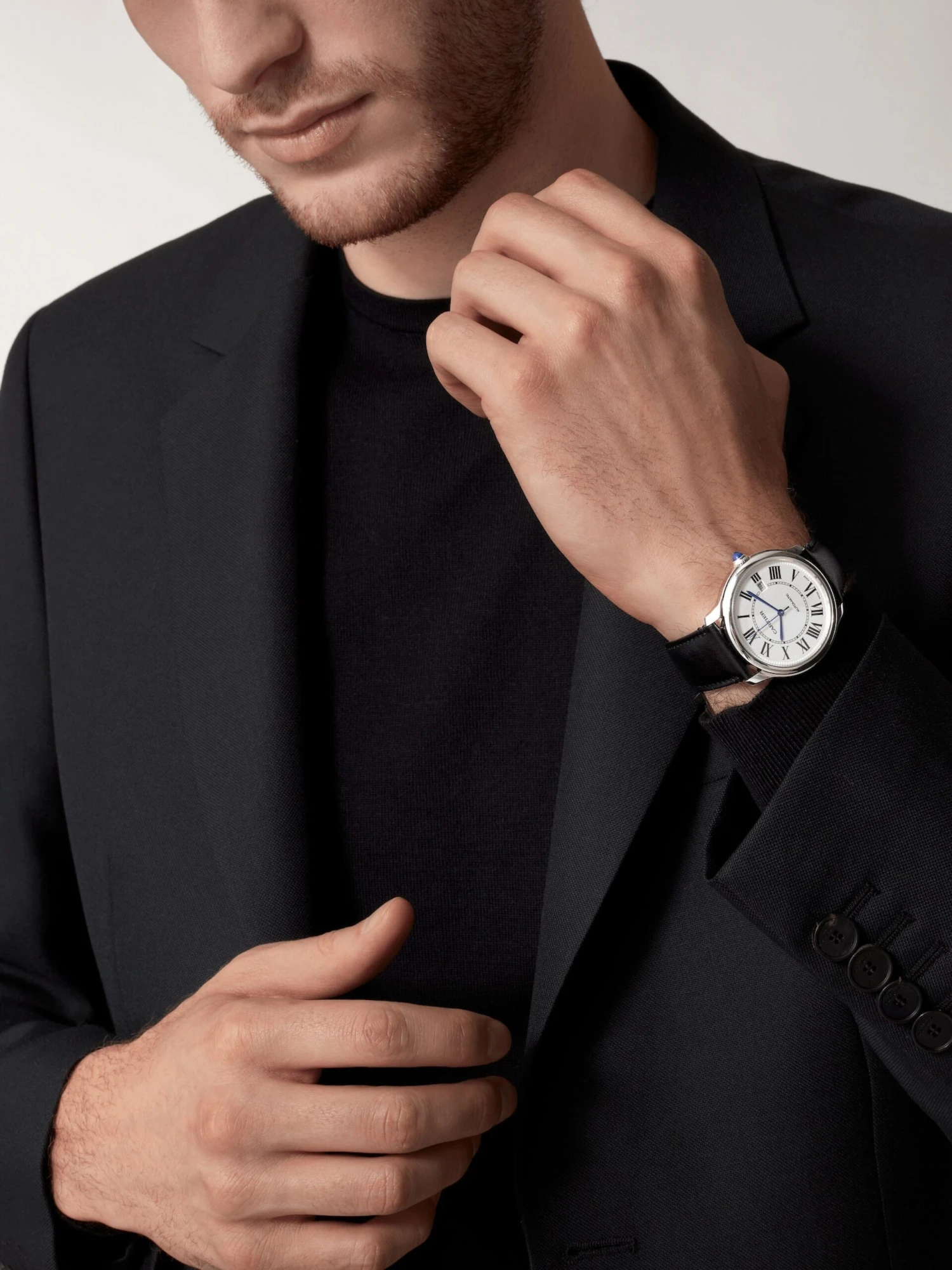 Ronde Must de Cartier watch, 40 mm, mechanical movement with automatic winding, caliber 1847 MC. Steel case, beaded crown set with a synthetic cabochon-shaped spinel, sandblasted silvered dial, blued-steel sword-shaped hands, sapphire crystal, black strap (made without animal materials), steel deployant buckle. Thickness: 9.62 mm. Water-resistant to 3 bar (approx. 30 meters/100 feet).