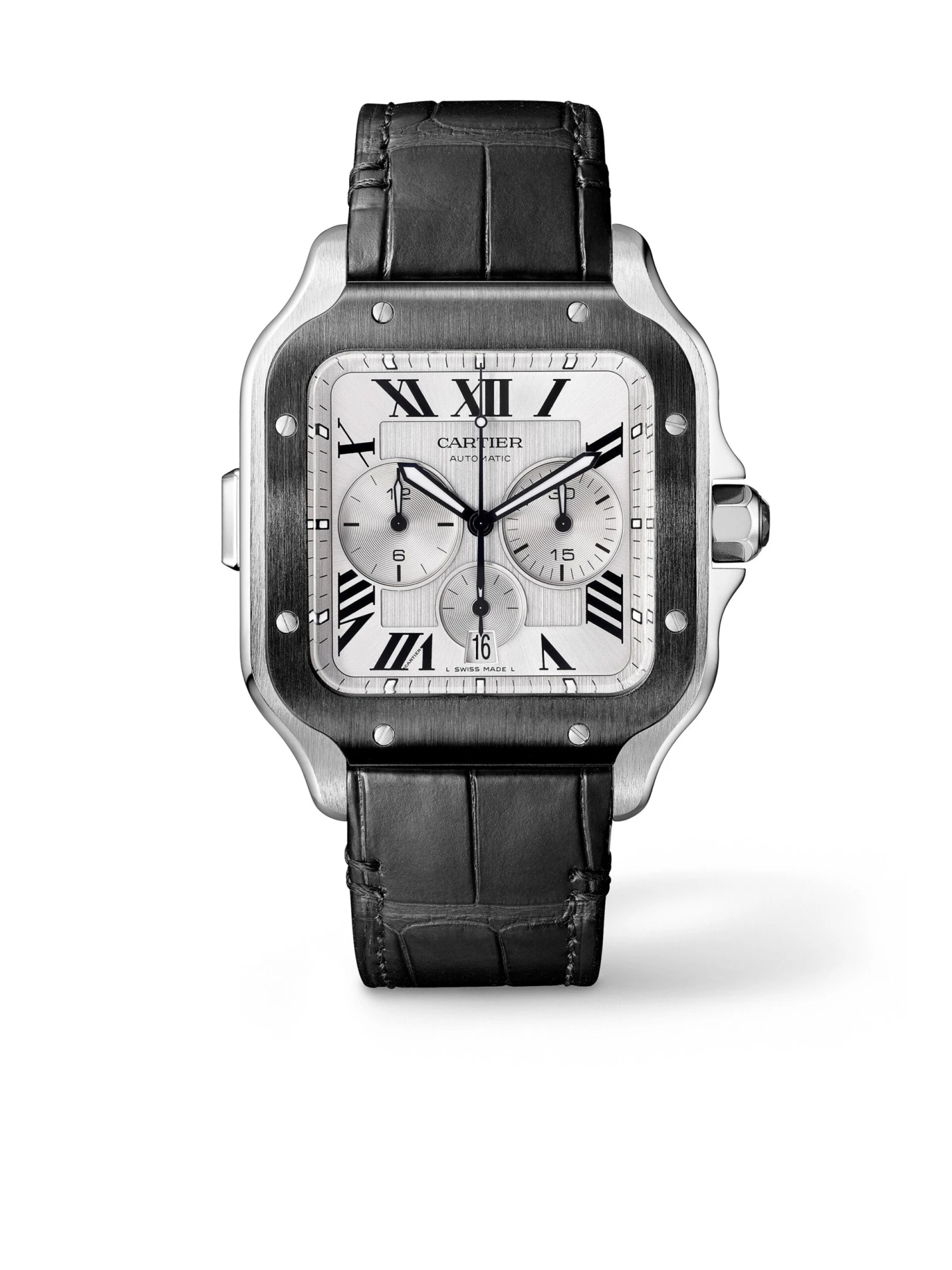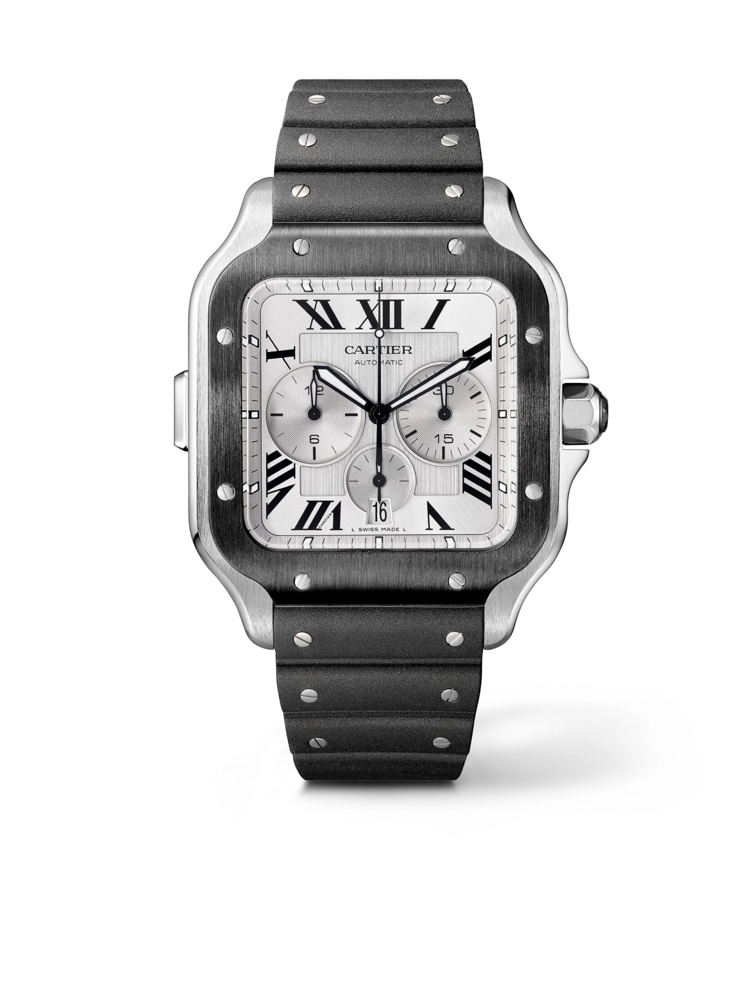 Santos watch, extra-large model, chronograph mechanical movement with automatic winding, caliber 1904 CH MC. Steel case, ADLC bezel, 7-sided crown set with a faceted black synthetic spinel, satin-brushed silver dial, black steel sword-shaped hands with luminescent material, sapphire crystal. First strap in rubber, second strap in black “Gomma” alligator leather, with steel folding buckle. Both bracelets are fitted with the “QuickSwitch” interchangeability system. Case width: 43.3 mm, case thickness: 12.4 mm. Water-resistant up to 10 bar (approx. 100 meters).