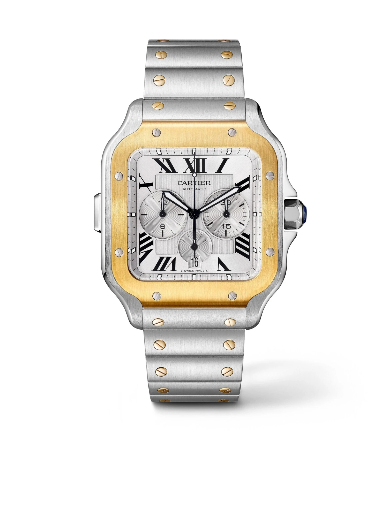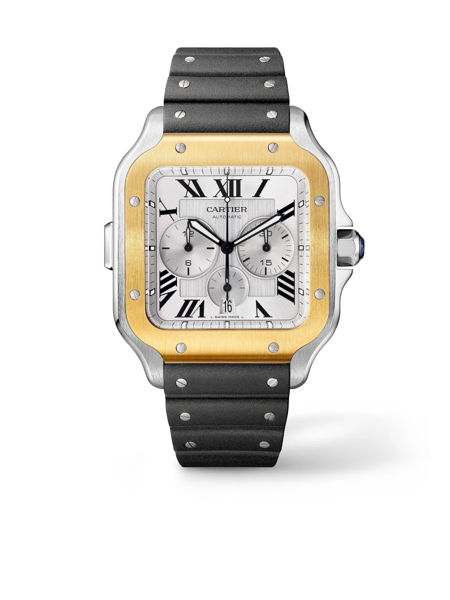 Santos watch, extra-large model, chronograph mechanical movement with automatic winding, caliber 1904 CH MC. Steel case, yellow gold 750/1000 bezel, 7-sided crown set with a faceted blue synthetic spinel, satin-brushed silver dial, black steel sword-shaped hands with luminescent material, sapphire crystal. Steel bracelet with “SmartLink” adjustment system. Second strap in rubber, with steel folding buckle. Both bracelets are fitted with the “QuickSwitch” interchangeability system. Case width: 44.9 mm, case thickness: 12.4 mm. Water-resistant up to 10 bar (approx. 100 meters).