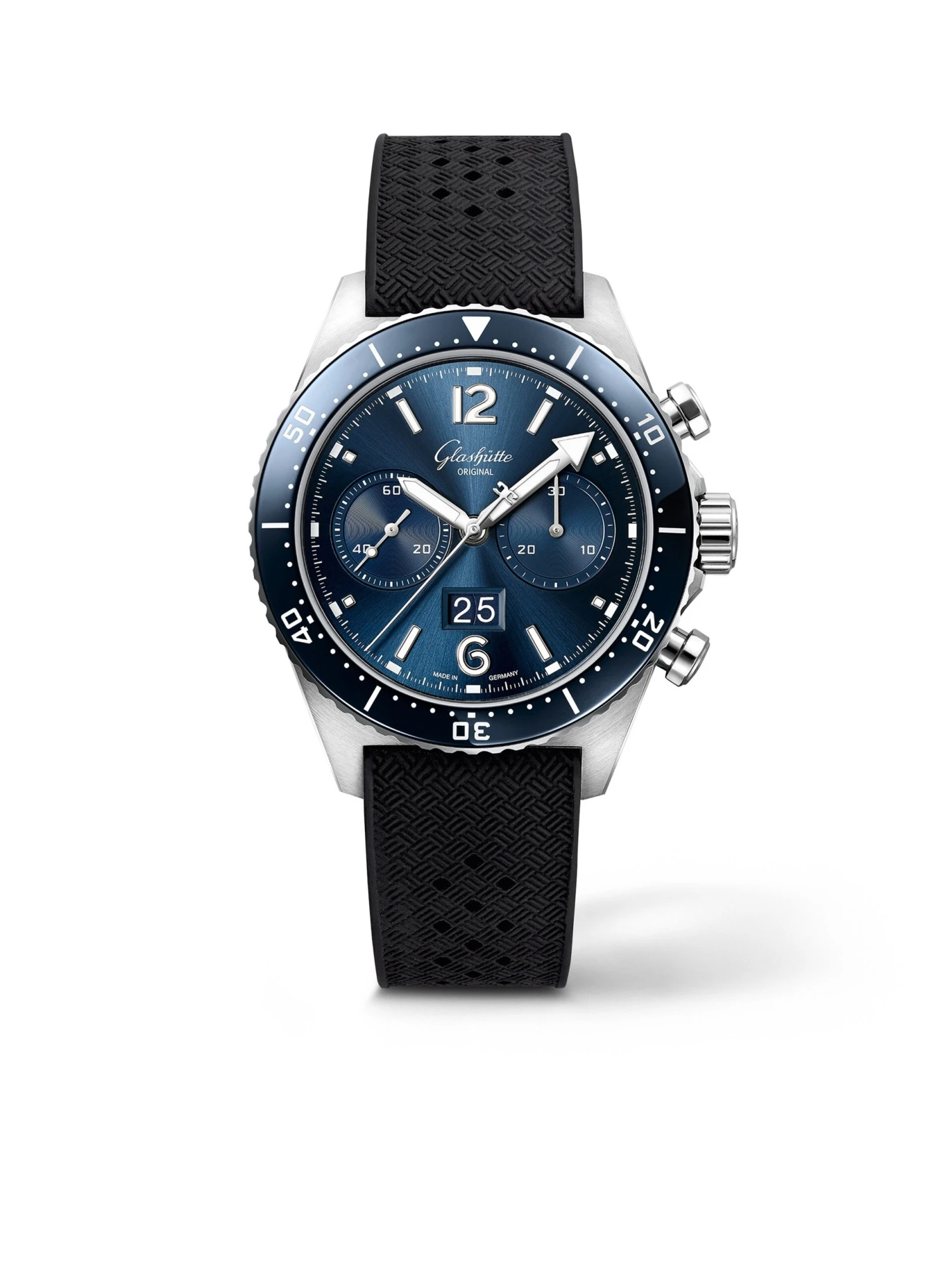 The SeaQ Chronograph (Ref. 1-37-23-02-81-33) combines the best features of the popular SeaQ timepieces with classic chronograph functions. Measuring 43.2 by 16.95 millimeters and water-resistant to 30 bar, the stainless steel case with a ceramic bezel for setting the dive time presents a clearly designed dial in intense blue. In addition to the small seconds subdial and 30-minute counter, the brand’s signature panorama date is positioned in this version at six o’clock. For perfect readability in all light and visibility conditions, the hands and hour markers are coated with luminous mass. Inside, behind a sapphire crystal caseback, there is the exquisitely finished self-winding manufacture caliber 37-32 with a power reserve of over 70 hours. The SeaQ Chronograph complies with the strict DIN and ISO standards for diving watches. A black strap made of robust rubber rounds off the sporty appearance of this men’s watch.