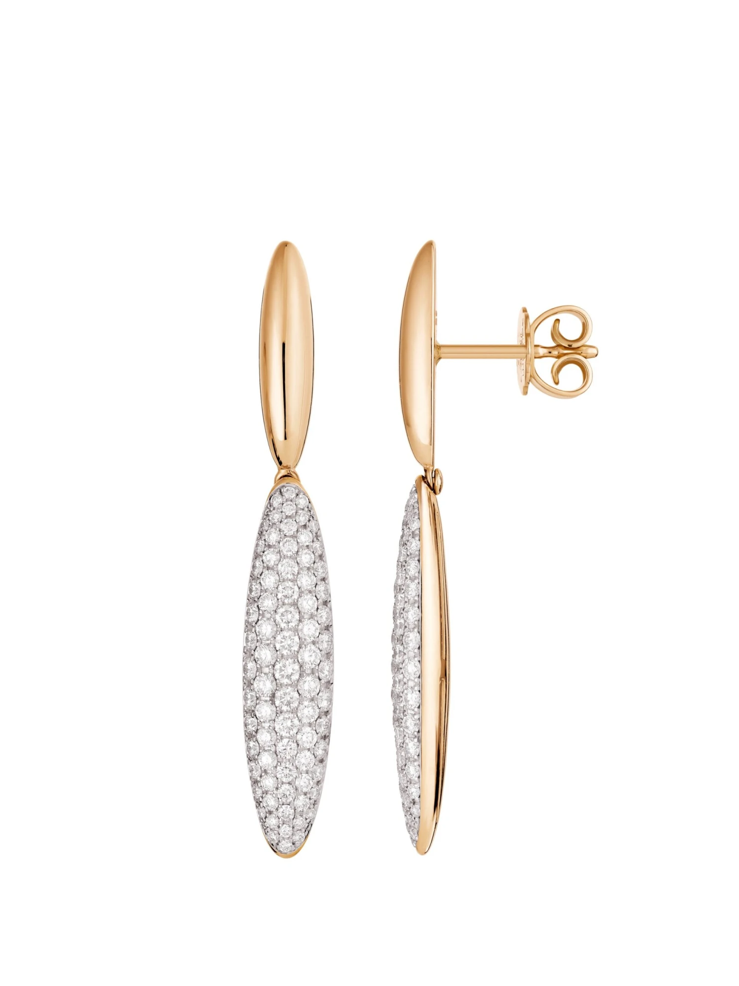 Energetic and sparkling: the Sensual Cocoon BY KIM earrings in 18k rose gold. The perfectly formed ellipses with a sophisticated brilliant-cut diamond pavé caress the face of the wearer in reflected light and embody self-confidence.