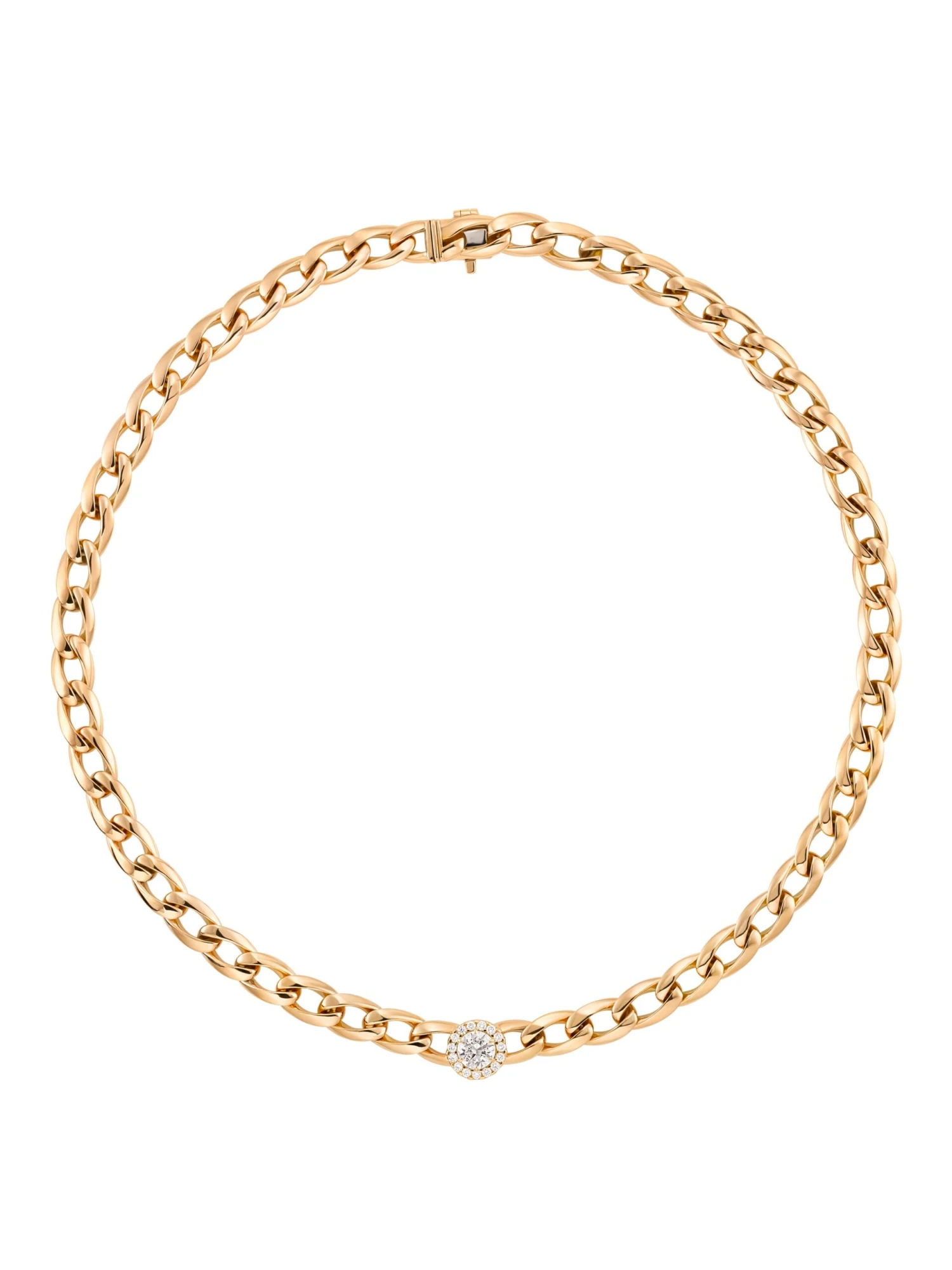 Massive chains with large links remain in vogue. The Sensual Revival BY KIM necklace combines the particularly trendy curb link chain made of warmly shimmering 18k rose gold with a sparkling Crown element as a decorative eye-catcher. A brilliant-cut diamond of 1.00 ct surrounded by 15 other brilliant-cut diamonds with a total carat weight of 0.25 ct makes the wearer shine with self-assurance and adds an elegant touch to any outfit.