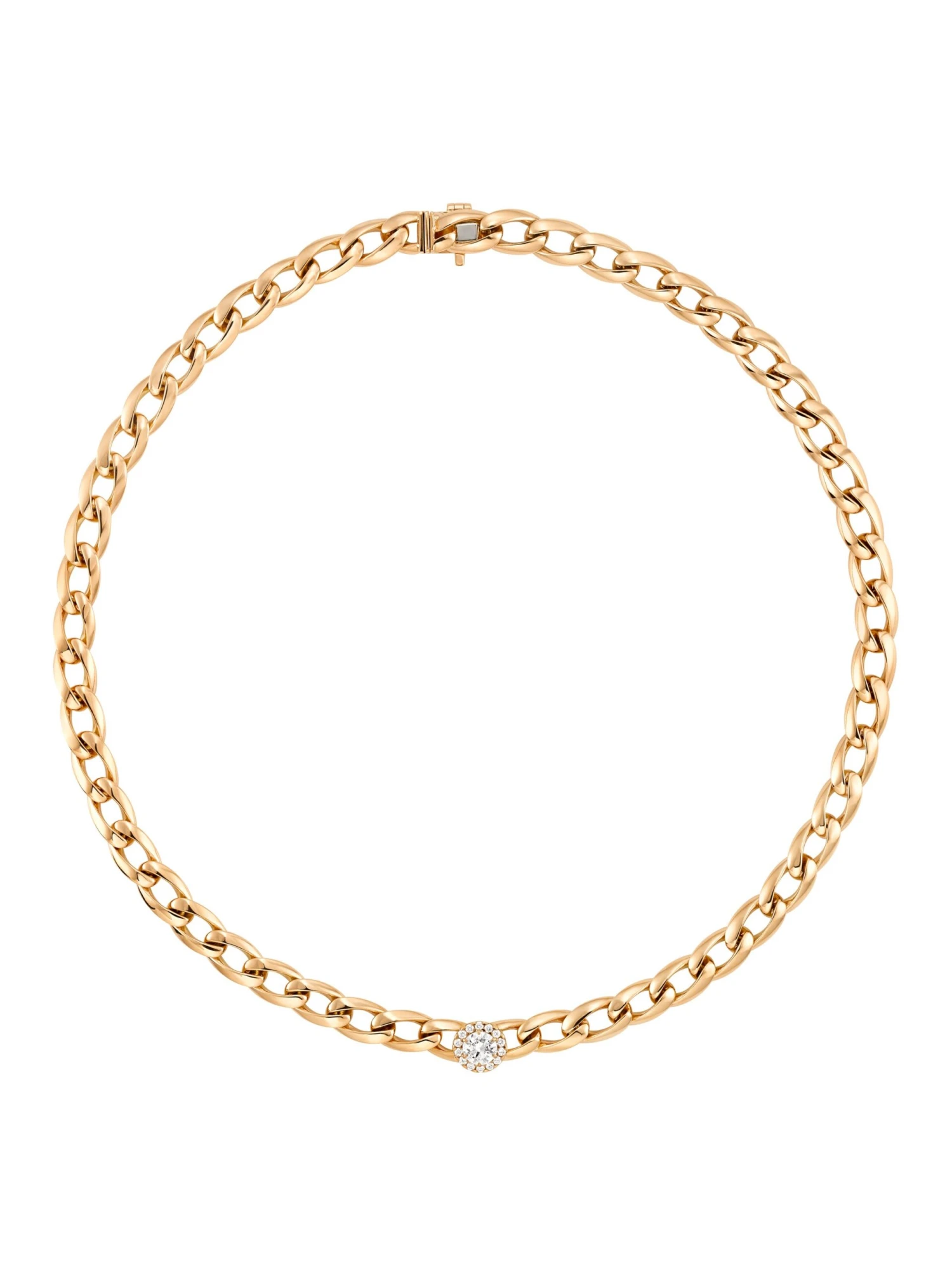 Massive chains with large links remain in vogue. The Sensual Revival BY KIM necklace combines the particularly trendy curb link chain made of warmly shimmering 18k rose gold with a sparkling Crown element as a decorative eye-catcher. A brilliant-cut diamond of 0.75 ct surrounded by 14 other brilliant-cut diamonds with a total carat weight of 0.21 ct makes the wearer shine with self-assurance and adds an elegant touch to any outfit.
