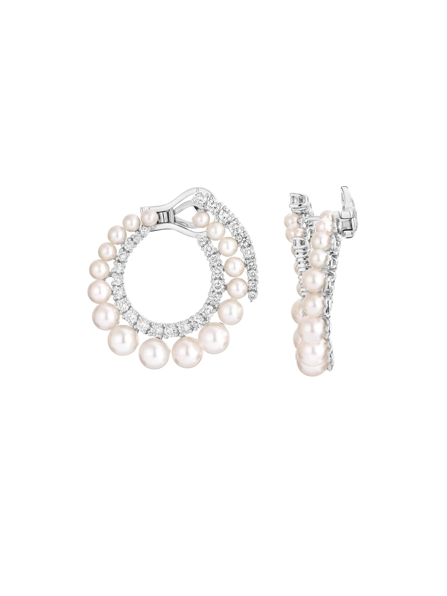 Earrings with a wow factor. 17 shimmering cultured Akoya pearls in slightly graduated sizes form a subtly tilted circle that nonchalantly ends behind the earlobe. The design is complemented by 31 sparkling brilliant-cut diamonds that softly adapt to the dynamic shape. The Spotlight by Wempe Statements earrings in 18k white gold are the perfect alternative to classic hoop earrings. They are extremely decorative and stand out due to their clean design.