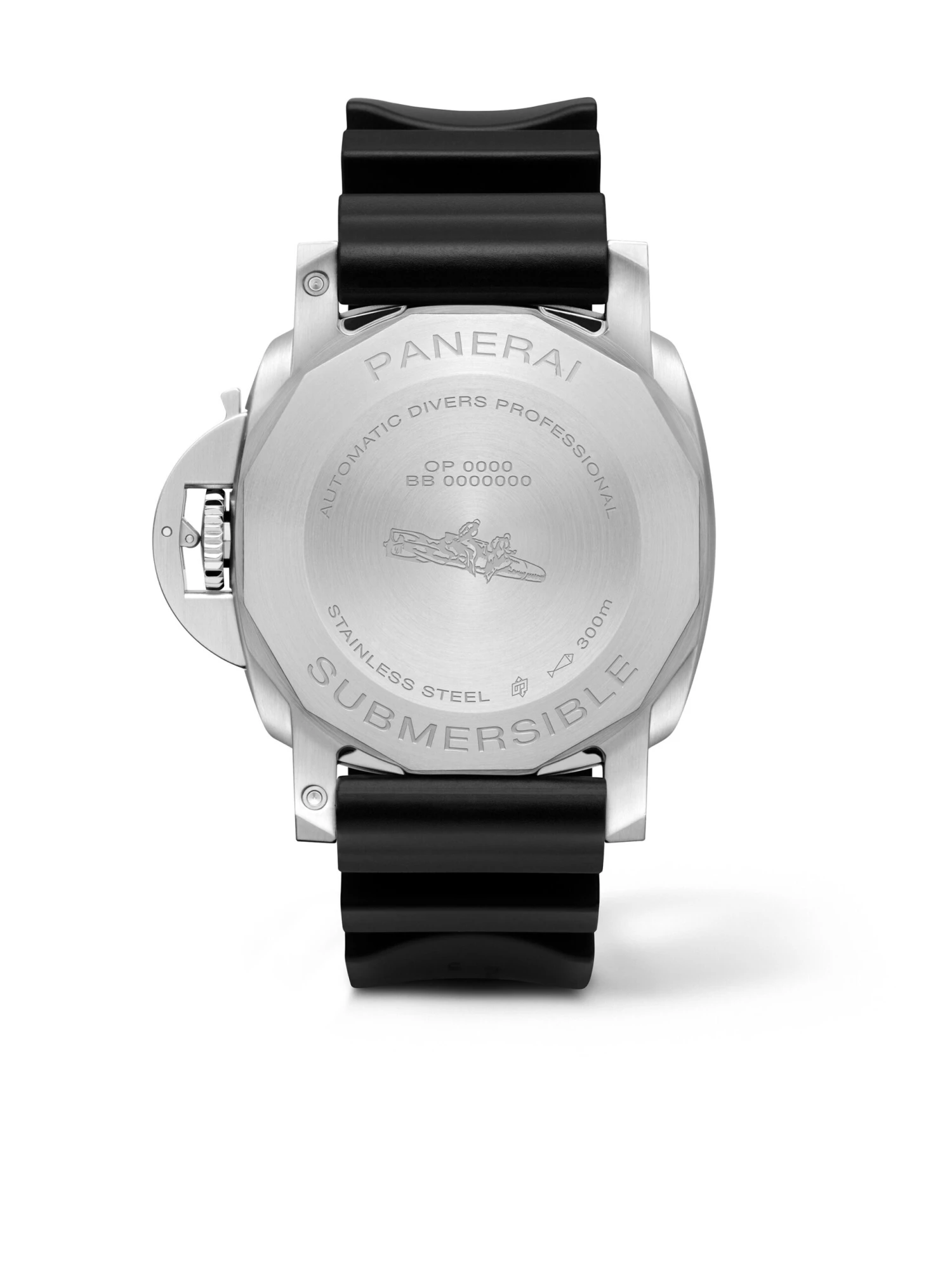 With the 44-millimeter case of the Submersible QuarantaQuattro Ref. PAM01229, Panerai introduces a third diameter size in the Submersible line. The case, which is water-resistant to 300 meters, is made of satin-finished steel and features a distinctive crown protection and a counterclockwise rotating bezel. Inside the case ticks manufacture caliber P.900 with a small seconds subdial at nine o’clock and date display at the 3 o’clock, which builds up a power reserve of three days. The fluorescent hour markers and hand tips are easy to read on the black dial even in difficult lighting conditions. Matching the dial, the sporty timepiece is fitted on a black rubber strap made from 30% recycled material.