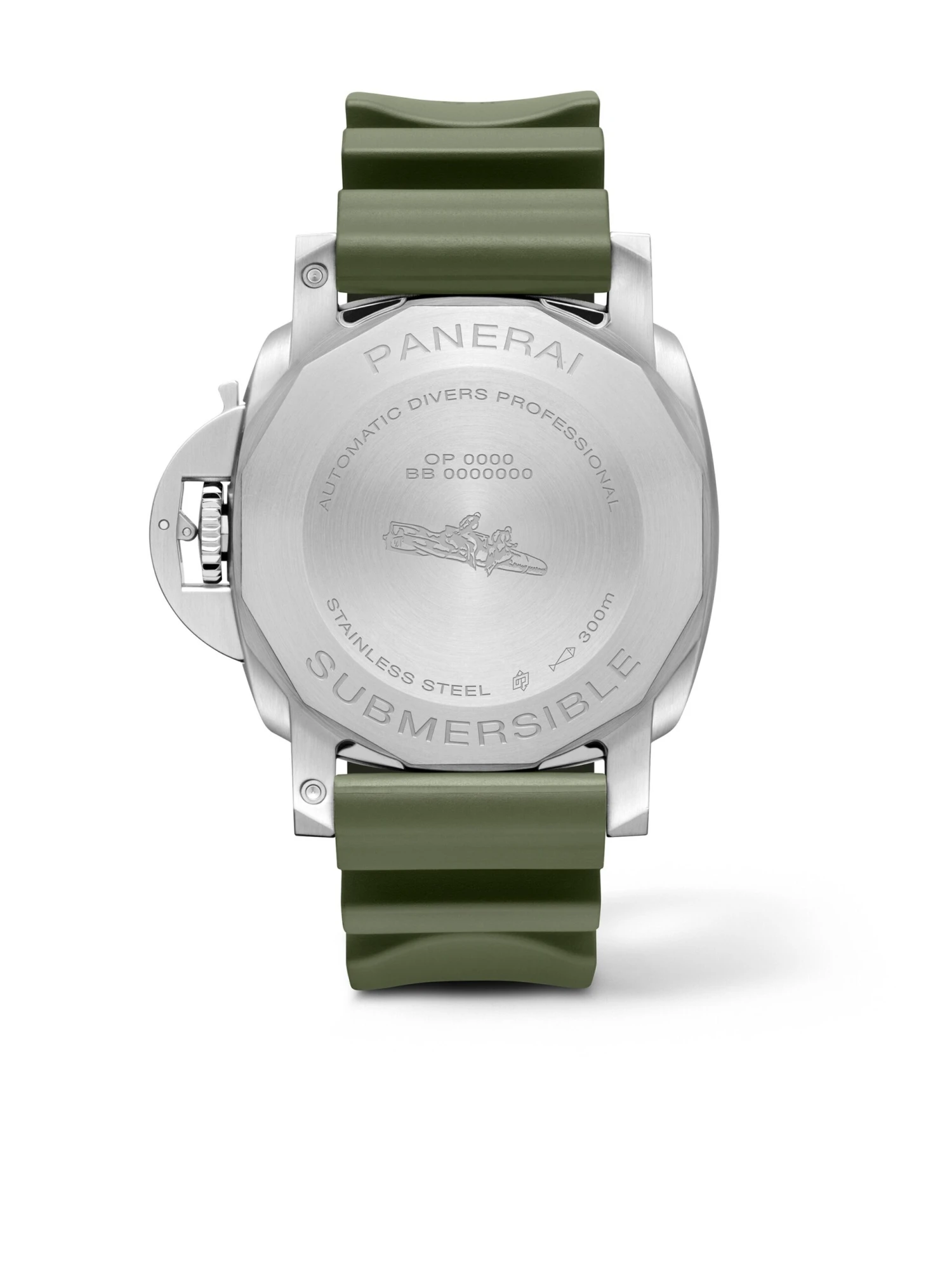 With the 44-millimeter case of the Submersible QuarantaQuattro Bianco Ref. PAM01226, Panerai introduces a third diameter size in the Submersible line. The case, which is water-resistant to 300 meters, is made of satin-finished steel and features a distinctive crown protection and a counterclockwise rotating bezel. Inside the case ticks manufacture caliber P.900 with a small seconds subdial at nine o’clock and date display at the 3 o’clock, which builds up a power reserve of three days. The fluorescent hour markers and hand tips are easy to read on the white dial even in difficult lighting conditions. Matching the dial, the sporty timepiece is fitted on a navy green rubber strap made from 30% recycled material.