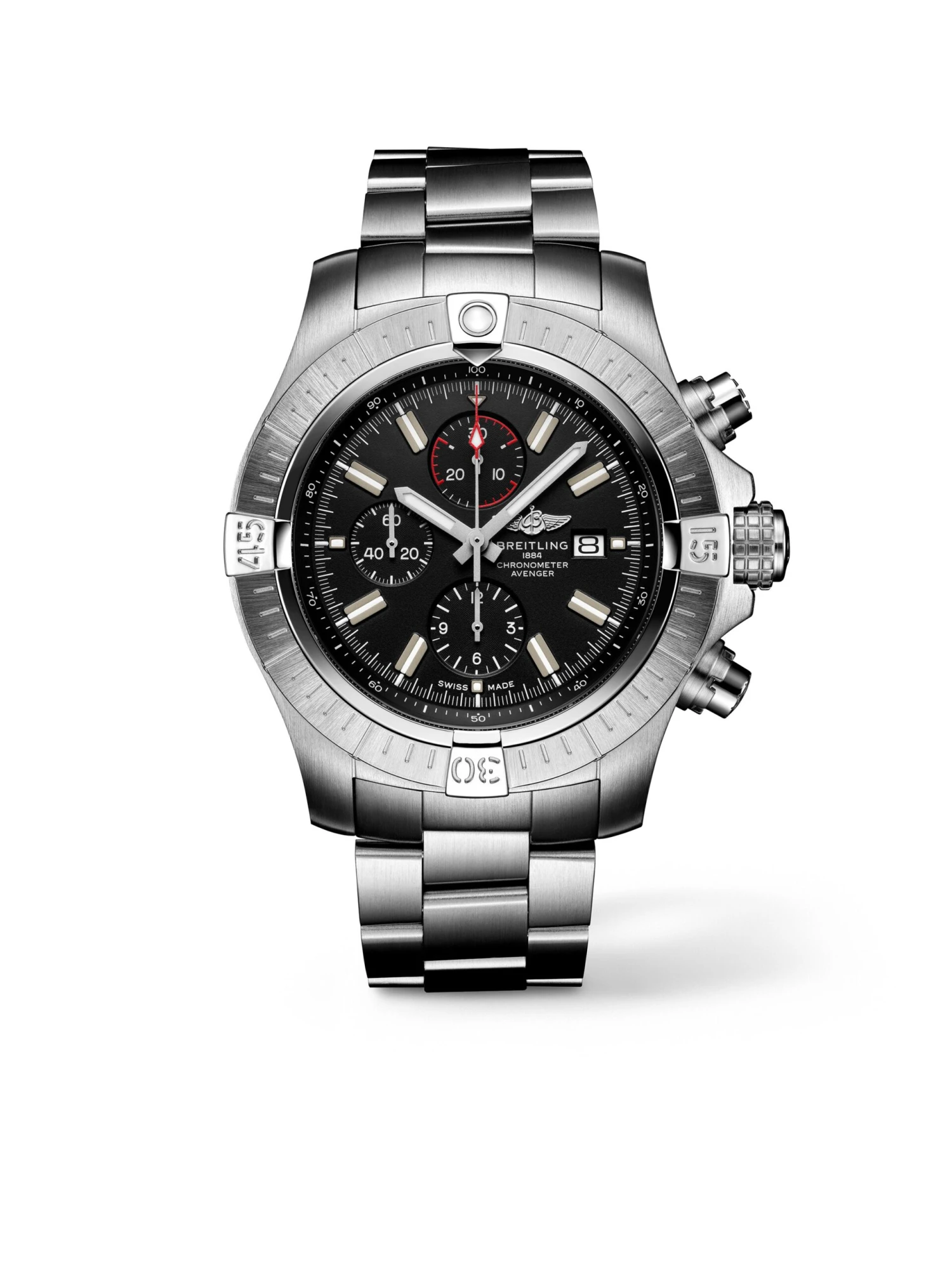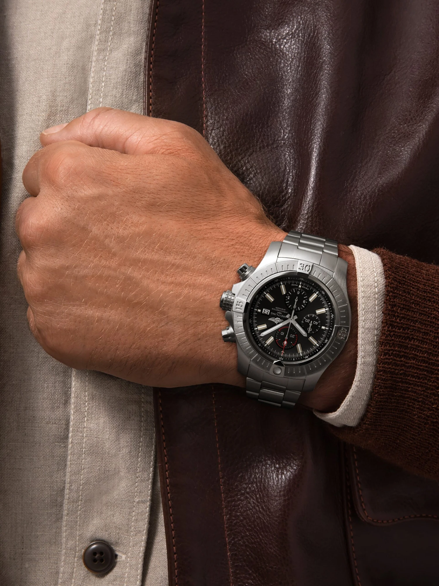 With its striking 48 millimeter diameter, the Super Avenger Chronograph makes a true statement. The automatic aviator watch is designed for robustness: The stainless steel case, pressure-resistant to 30 bar, is held by a solid stainless steel strap. The bezel is equipped with a special grip pattern on the crown and chronograph push-pieces so that the timepiece can also be easily operated with gloves. Thanks to its COSC-certified Breitling Caliber 13, the Super Avenger Chronograph 48 measures to the nearest quarter of a second.