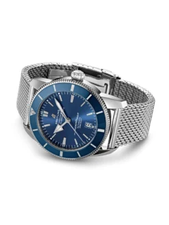 The Breitling Superocean Héritage II revisits the Superocean style of 1957. The self-winding watch in the 46 millimeter and 15 millimeter stainless steel case is ideally suited to the sporty leisure look thanks to its blue dial, matching scratch-resistant ceramic bezel and retro-style steel mesh strap.