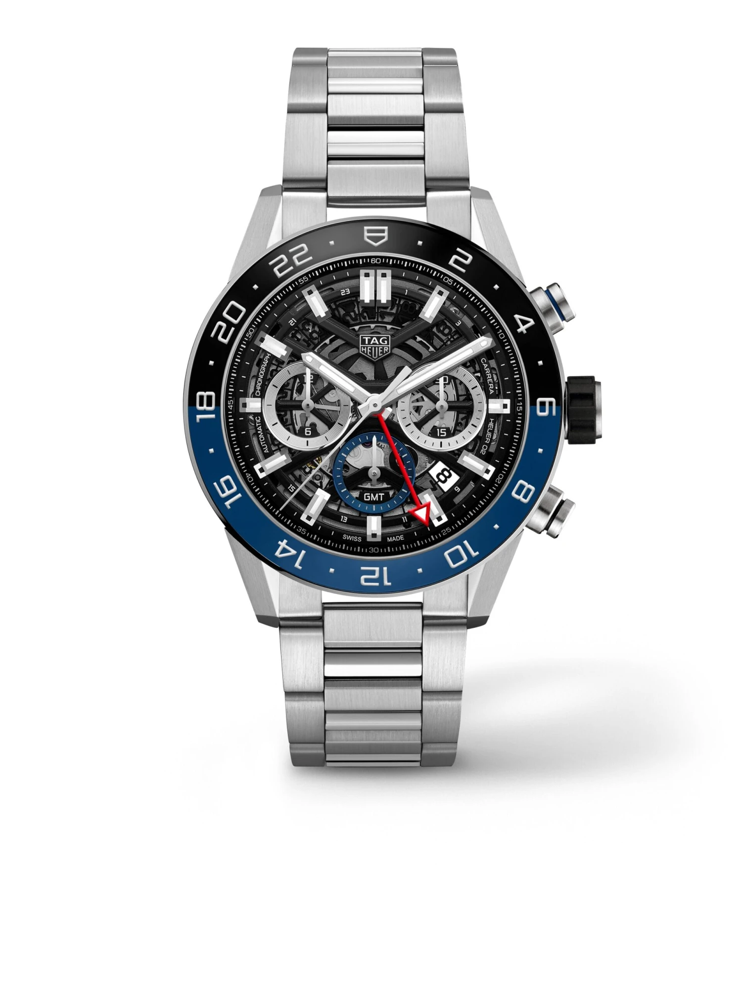 Since the 1960s, the Carrera has been synonymous with professional racing-driver watches and luxury chronographs. The Carrera Calibre Heuer-02 GMT, reference CBG2A1Z.BA0658, combines time-telling with the display of a second time zone. The latter is easily adjusted via the crown and is indicated by a red hand. The masterfully crafted skeleton dial exposes the Heuer-02 automatic manufacture movement with column-wheel control and vertical clutch. The self-winding caliber possesses an impressive power reserve of 75 hours. The Carrera Calibre Heuer-02 GMT has a diameter of 45.0 millimeters and is water-resistant up to 100 meters.