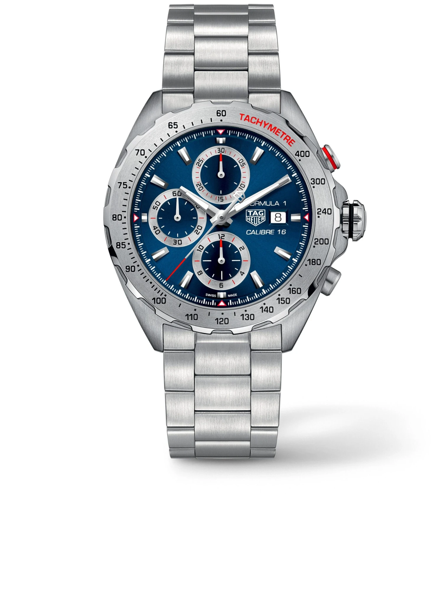 Precision and performance play equally important roles in the world of fast cars and timekeeping. After all, both involve studying the fractions of a second. The Formula 1 Calibre 16, reference CAZ2015.BA0876, is a self-winding watch which reflects a perfect combination of state-of-the-art mechanics and bold design. Driven by the automatic Calibre 16, it comes in a 44.0-millimeter stainless-steel case which is water-resistant up to 200 meters. The blue tone of the dial gleams with fine sunray decoration and provides a backdrop for the blue totalizers.