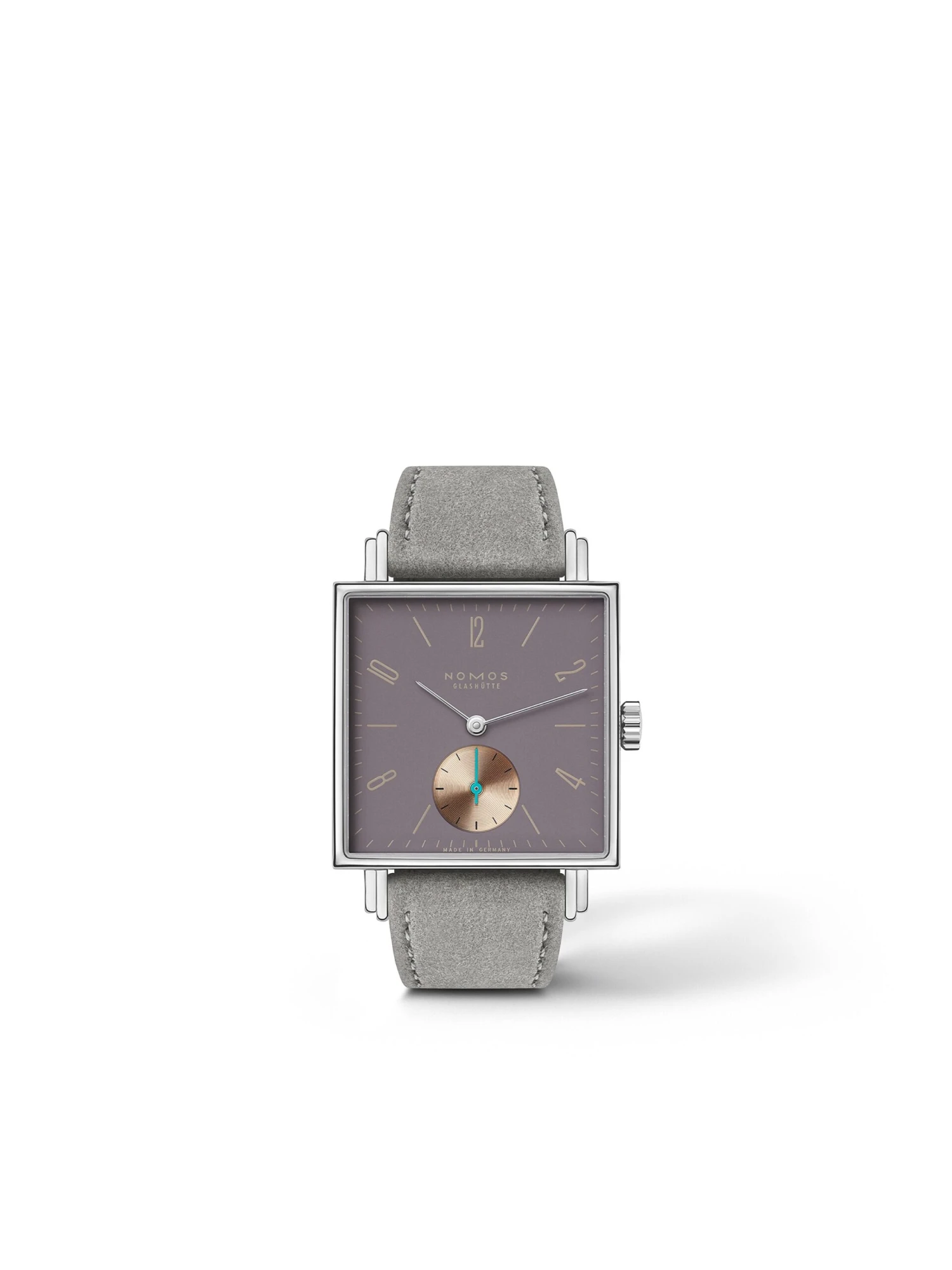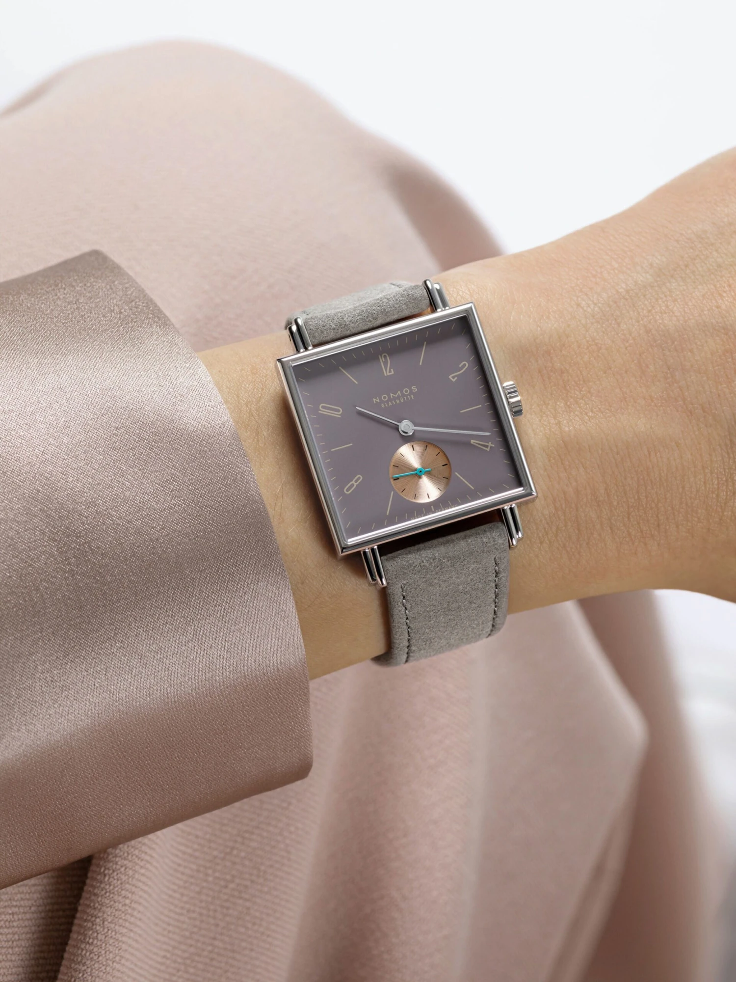 The Tetra is the four-cornered sister of the legendary Tangente β its typografie, however, has a slightly more modern touch. Its square stainless-steel case, measuring 29.5 Γ 29.5 millimeters, houses an aubergine-colored dial, which is complemented by a rose gold small seconds subdial with a turquoise second hand. The model with the name Tetra β die Fuchsteufelswilde (Ref. 425) is powered by hand-wound manufacture caliber Alpha. A velvety gray bracelet made of vegan velour skillfully rounds off the self-confident appearance.