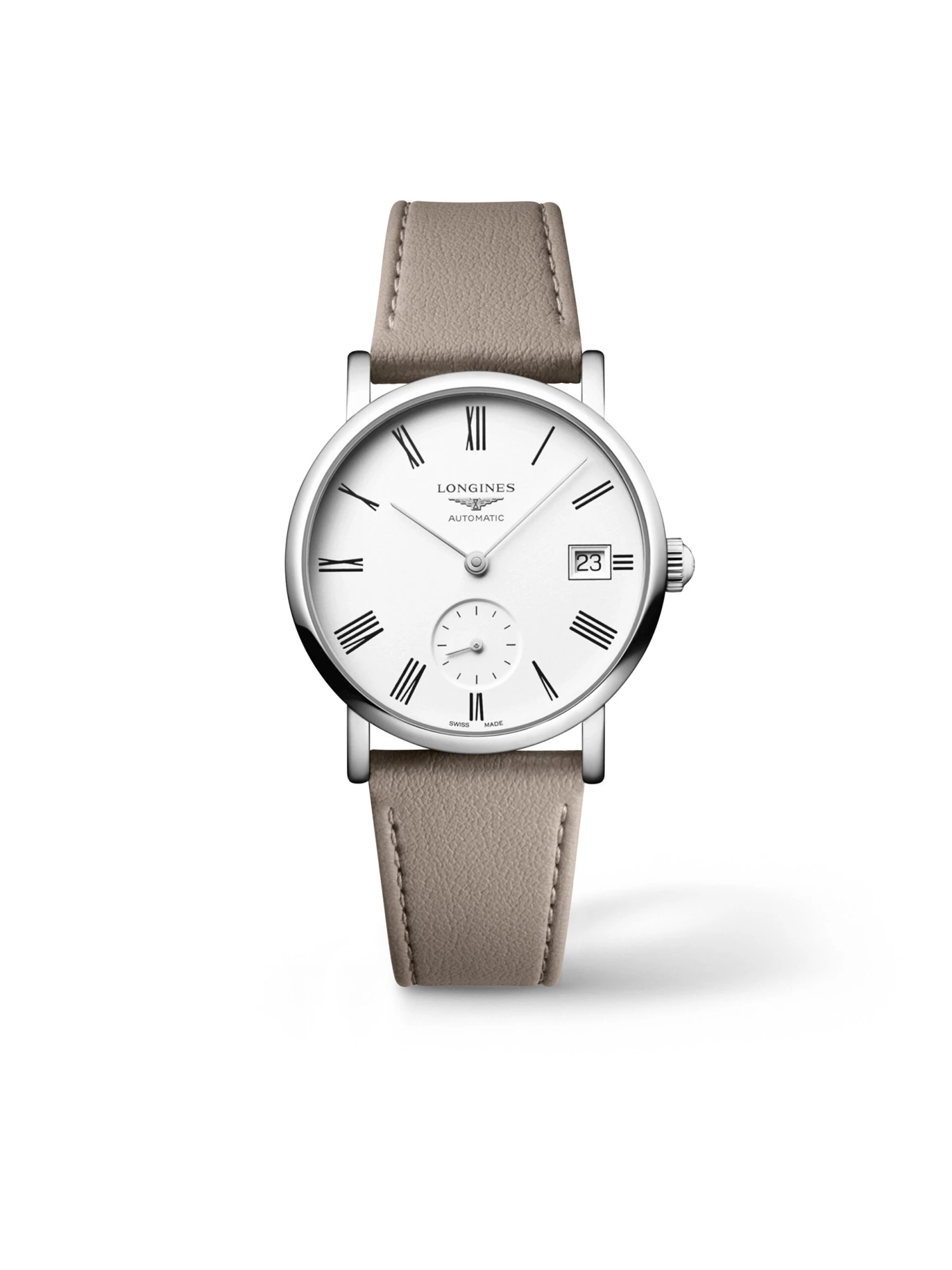 Classic elegance put in its purest form. The Longines Elegant Collection (Ref. L4.312.4.11.2) combines graceful hands and black Roman numerals with a date window at three o’clock on its matte white dial. The small seconds subdial blends in harmoniously because of its same color design. Inside the case and visible through a sapphire crystal caseback, there is self-winding caliber L891 with an impressive power reserve of up to 72 hours. A beige textile strap holds the 34-millimeter stainless-steel watch securely on the wrist.