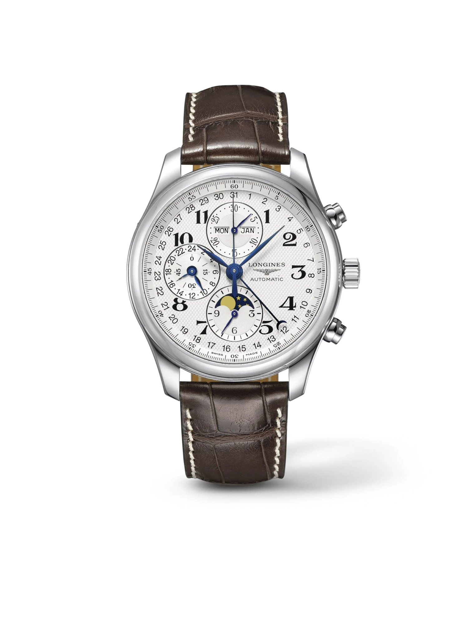 The Master Collection column-wheel chronograph features a small seconds hand with a 24-hour indication, a date indicator with a crescent moon at the central hand, a 30-minute counter with day of the week and month at twelve o’clock and a moon-phase indicator at six o’clock. The stainless steel case measures 42 millimeters in diameter.