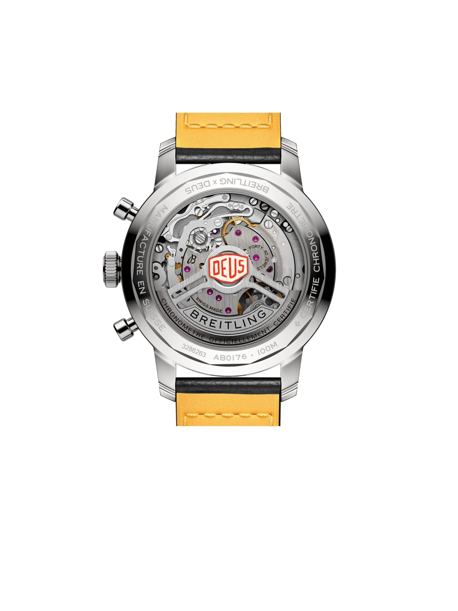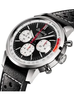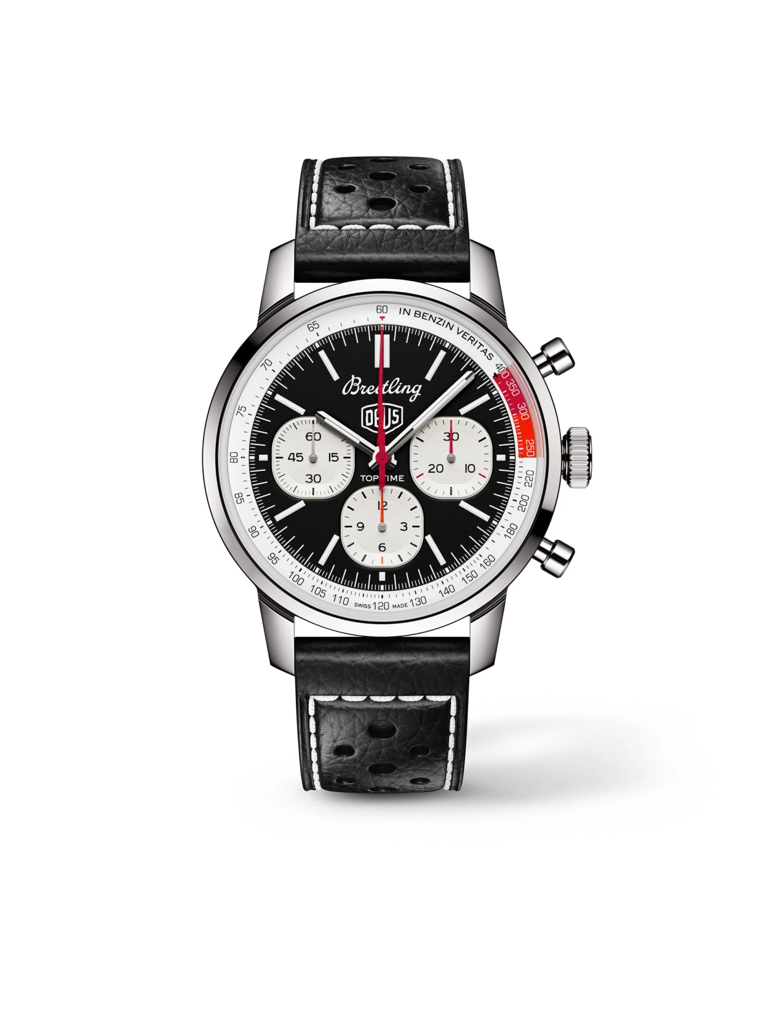 Created in the 1960s that were inspired by freedom and fun, the Top Time collection from Breitling stands for unconventional chronographs that capture the spirit of the times. The Top Time B01 Deus model was created in cooperation with the Australian surf and motorcycle outfitter Deus Ex Machina. The chronograph (Ref. AB01765A1B1X1) impresses with details such as the motto “In benzin veritas” on the edge of the dial, whose overall design is reminiscent of the old dashboard displays of sports cars, and a chronograph hand in the shape of a lightning bolt. Under the hood, the extraordinary manufacture caliber Breitling 01 makes its mark in terms of performance.