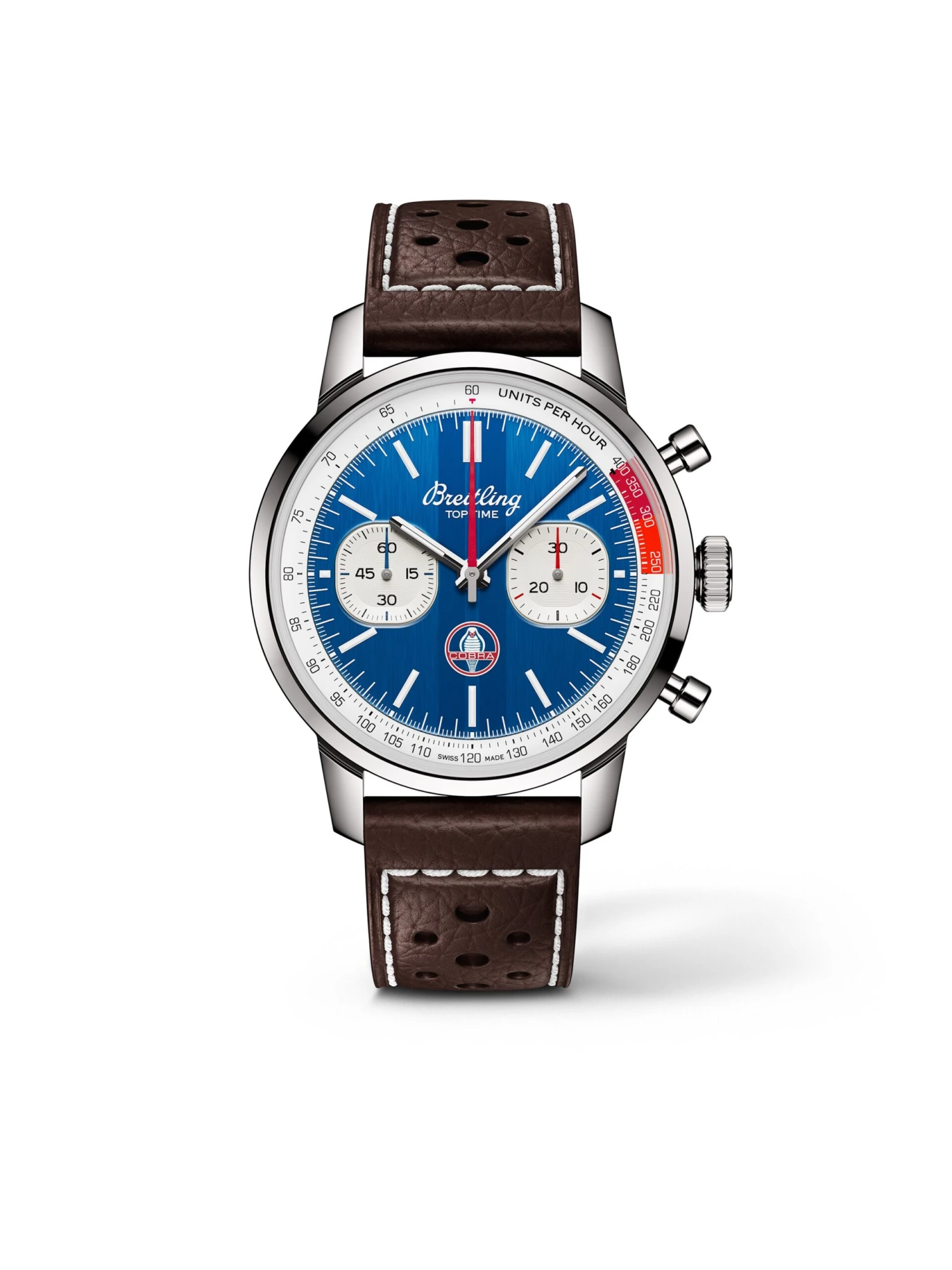 The Top Time B01 Shelby Cobra (AB01763A1C1X1) impressively celebrates a classic sports car that not only gives its name to this 41-millimeter motorsport chronograph, but also decisively shapes its design. As absolute highlights, the vintage logos of Breitling and Shelby Cobra on the blue dial immediately catch the eye. Below them, three recessed subdials in black present themselves with a record fluting that recalls rock’n’roll and the subculture from which the Top Time once originated. The transparent caseback also displays the Shelby Cobra logo and provides a view of self-winding manufacture caliber B01, which has a convincing power reserve of up to 70 hours. This retro-style stainless steel watch is held securely on the wrist by a brown calfskin strap with light-colored stitching and is water-resistant to 100 meters.