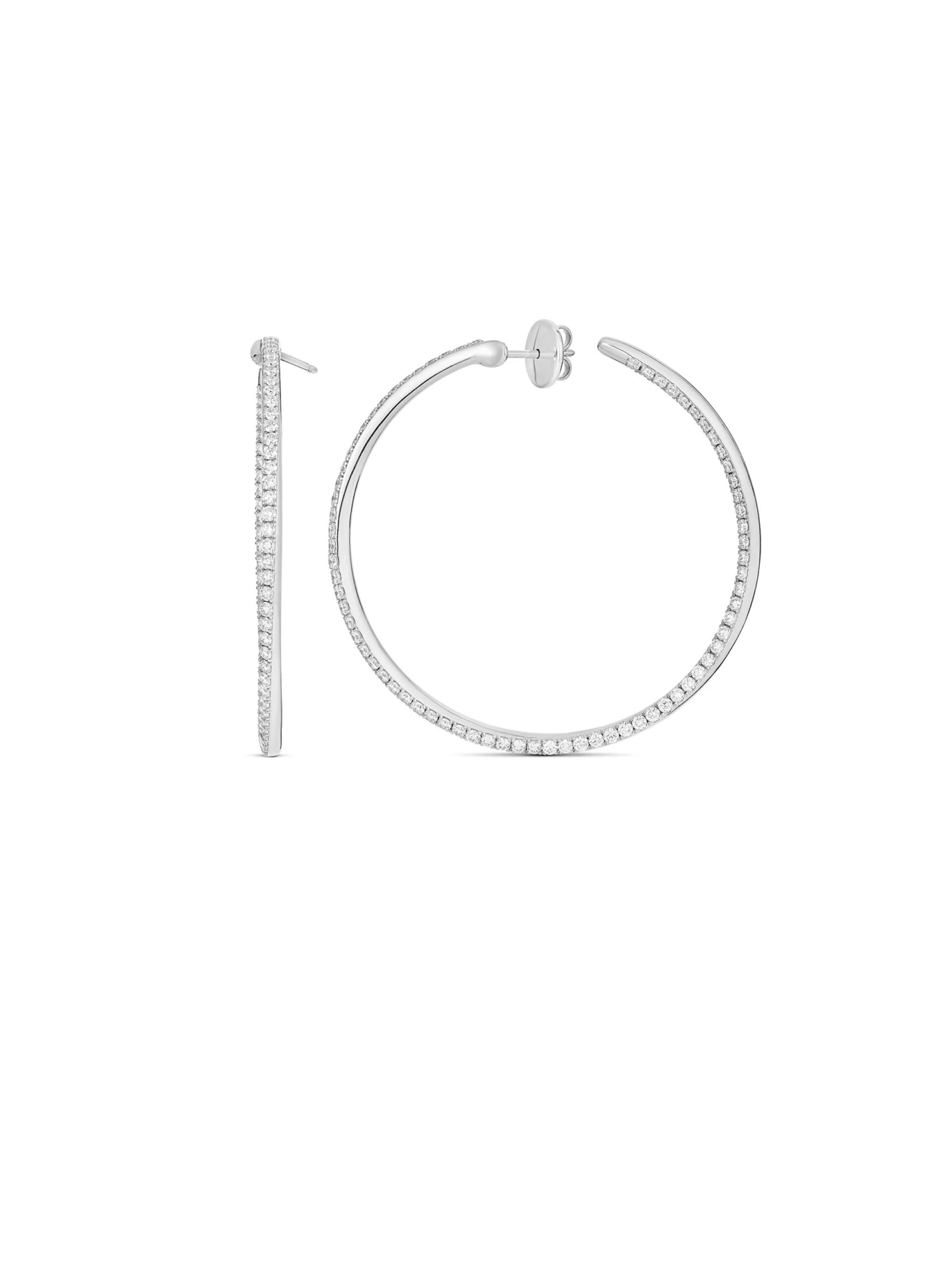 The Uptown by Wempe Statements hoop earrings in 18k white gold fascinate both on first and second glance. Their imposing size alone of 4.4 cm in diameter makes them a true statement piece. However, the real highlight is their curved diamond stripes. 146 brilliant-cut diamonds and a total carat of 2.92 twist ingeniously around the glittering hoop earrings, accentuating their sparkle from every angle. Literally all-rounders which cast their spell over and over again on the beholder. Â