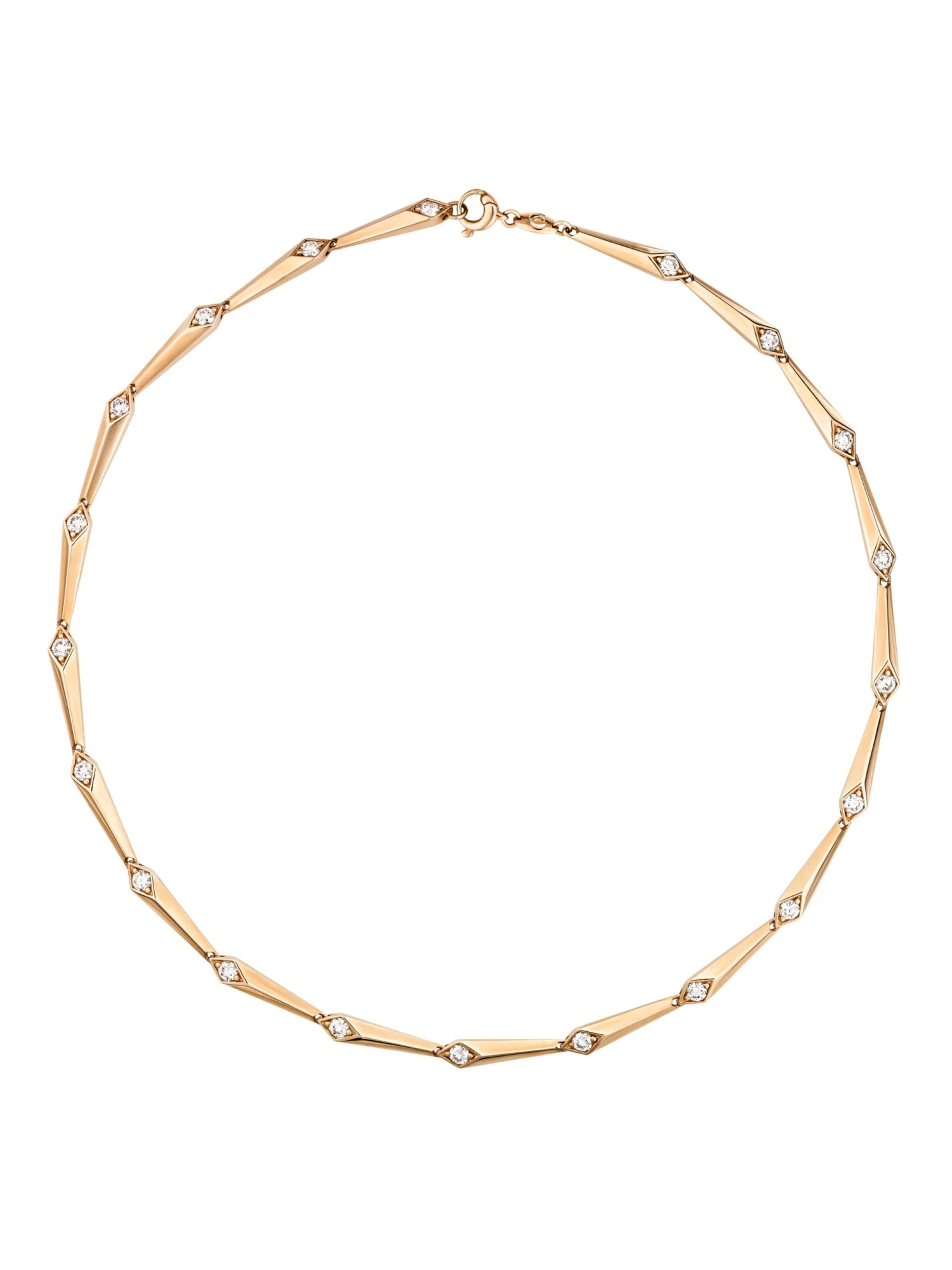 A purist design with that certain something. The Collier Uptown by Wempe Statements is composed of twenty graphic elements in warm 18k rose gold that mesh almost invisibly. Each element is set with a brilliant-cut diamond with a total carat weight of 2.90 ct. With a length of 42.5 centimeters, the necklace closely hugs the neck and adds a classy touch to a blouse, top, or fine turtleneck sweater.