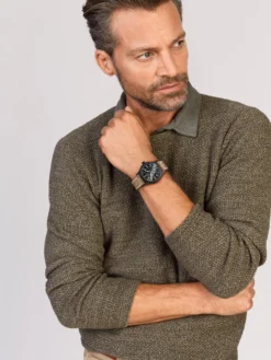 Designed with inspiration from classic aviator watch models and fitted with innovative, precise technology, our Zeitmeister Aviator Watch Large Date Antique is the ideal everyday companion. The 42-millimeter stainless-steel case with rugged, dark gray PVD coating is reminiscent of historical onboard instruments. The classic typography on the black dial with a second time zone display at 6 o’clock and a striking date display at 12 o’clock emphasizes the functional nature of this aviator watch. The numerals and hands are coated with Super-LumiNova®, ensuring good readability even in difficult lighting conditions. Inside the case, which is water-resistant to 5 bar, there is self-winding caliber TT651.00 (basis ETA 2892-A2). The chronometer-certified aviator watch comes with a sturdy, handmade brown canvas strap with stainless-steel pin clasp and suits thus any outfit, whether on business or out of hours. The Zeitmeister Aviator Watch Large Date Antique comes in an edition limited to 100 watches.