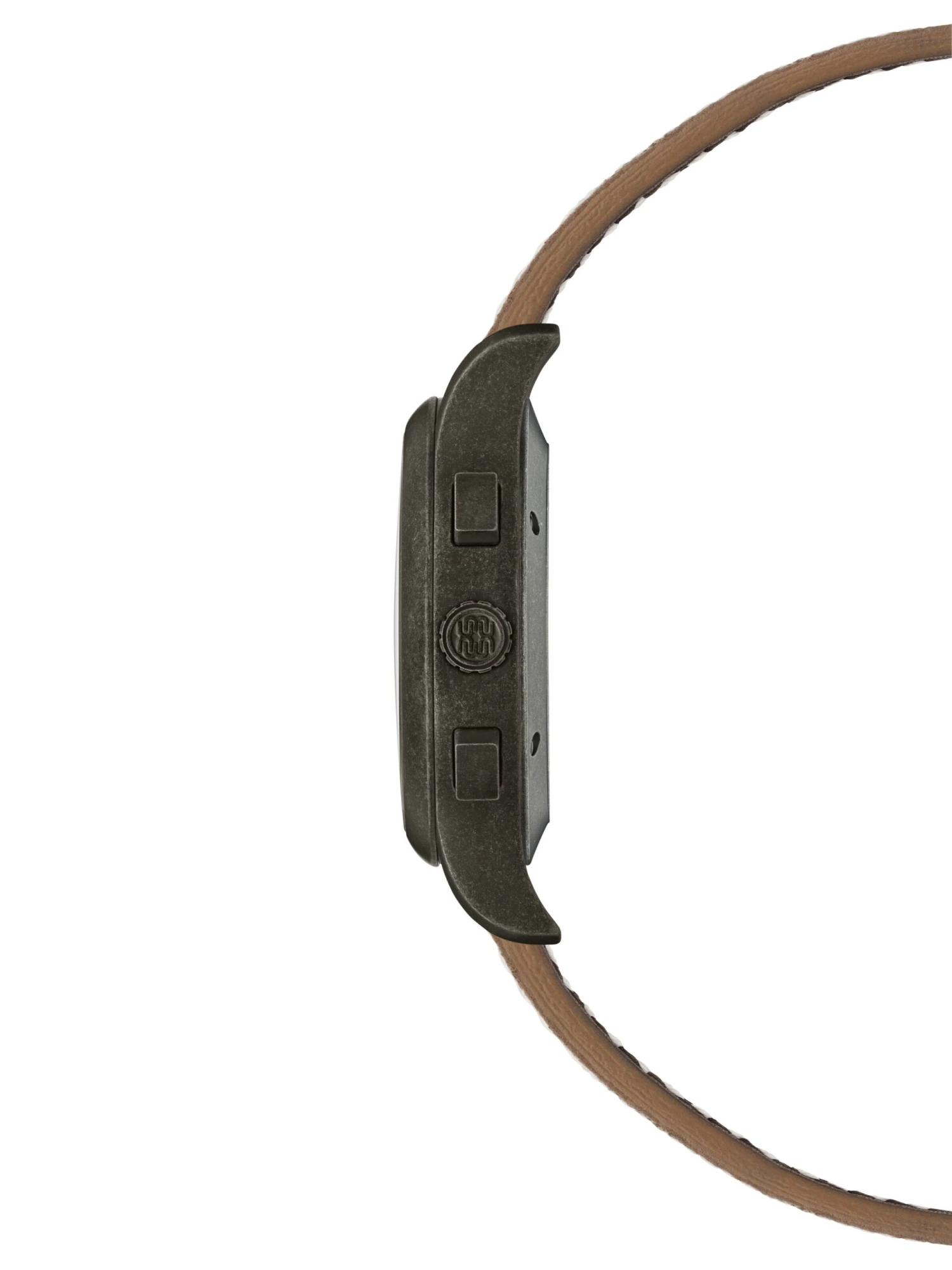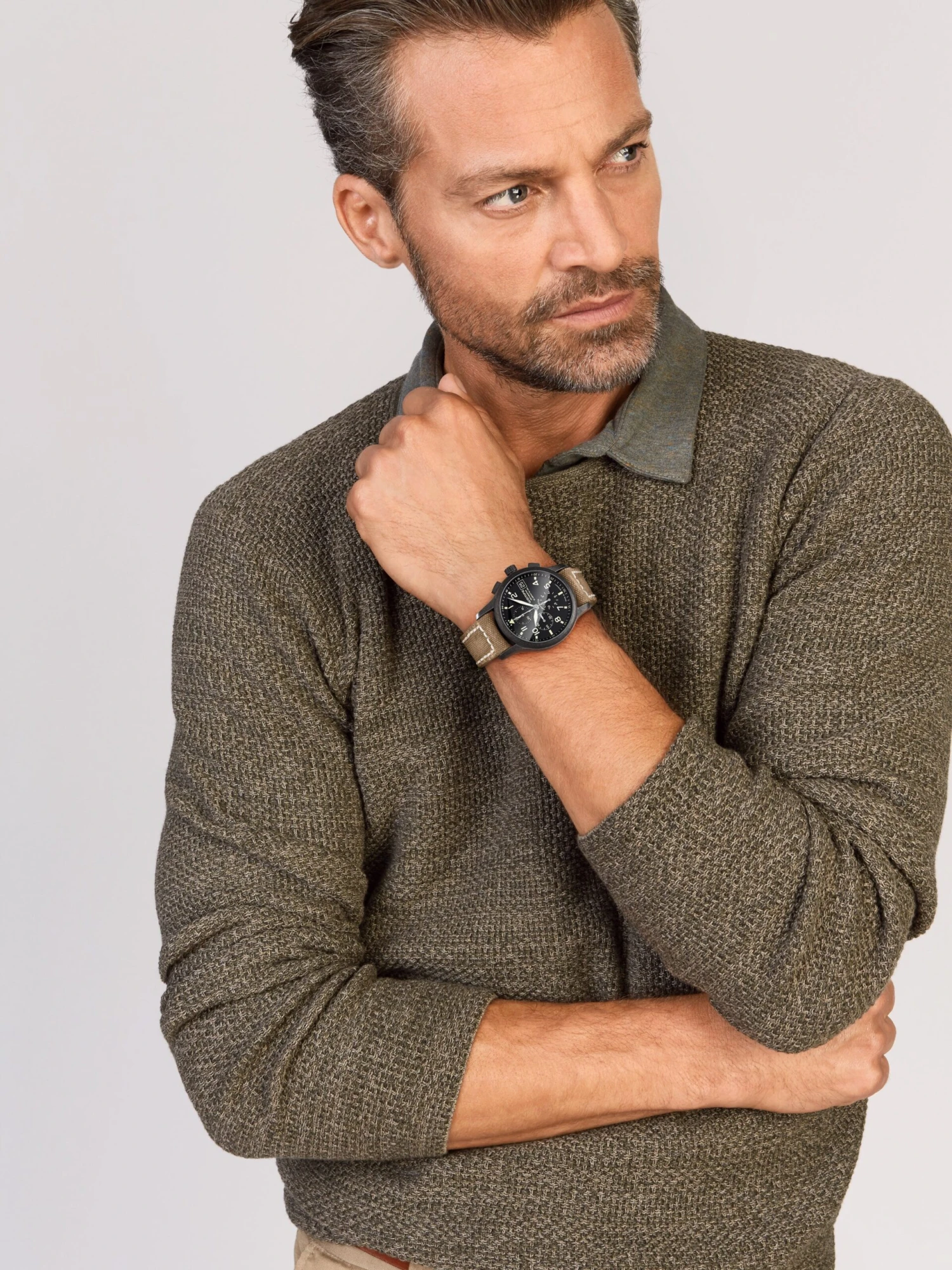 Designed with inspiration from classic aviator watch models and fitted with innovative, precise technology, our Zeitmeister Aviator Watch Chronograph XL Antique is the ideal everyday companion. The distinctive 45-millimeter stainless-steel case with rugged, dark gray PVD coating is reminiscent of historical onboard instruments. The classic typography on the black dial with black totalizers and a date display at 3 o’clock emphasizes the functional nature of this aviator watch. The numerals and hands are coated with Super-LumiNova®, ensuring good readability even in difficult lighting conditions. Inside the case, which is water-resistant to 5 bar, there is Swiss self-winding caliber ETA A07.211 with stop-seconds function and eccentric fine adjustment designed by Wempe. The chronometer-certified chronograph comes with a sturdy, handmade brown canvas strap with stainless-steel folding clasp and suits thus any outfit, whether on business or out of hours. The Zeitmeister Aviator Watch Chronograph XL Antique comes in an edition limited to 100 watches.